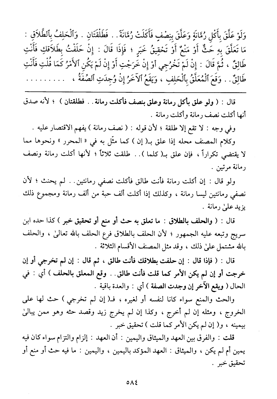وَلَوْ عَلَّقَ بِأَكْلِ رُمَّانَةٍ وَعَلَّقَ بِنِصْفٍ فَأَكَلَتْ رُمَّانَةً ... فَطَلْقَتَانِ. وَالْحَلِفُ بِالطَّلاًقِ: مَا تَعَلَّقَ بِهِ حَثٌّ أَوْ مَنْعٌ أَوْ تَحْقِيقُ خَبَرٍ؛ فَإِذَا قَالَ: إِنْ حَلَفَتُ بِطَلاَقكِ فَأَنْتِ طَاِلقٌ, ثُمَّ قَالَ: إِنْ لَمْ تَخْرُجِي أَوْ إِنْخَرَجْتِ أَوْ إِنْ لَمْ يَكُنِ الأَمْرُ كَمَا قُلْتِ فَأَنْتِ طَالْقٌ ... وَقَعَ الْمُعَلَّقُ بِالْحَلِفِ, وَيَقَعُ الآخَرُ إِنْ وُجِدَتِ الصِّفَةُ, ...