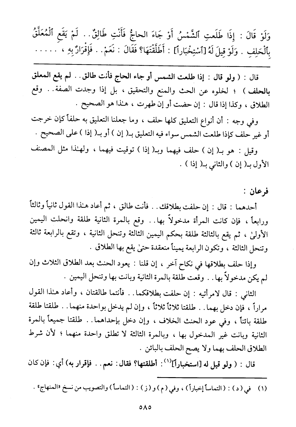 وفي وجه: أن أنواع التعليق كلها حلف, وما جعلنا التعليق به حلقًا كإن خرجت أو غير حلف كإذا طلعت الشمس سواء فيه التعليق بـ (إن) أو بـ (إذا) على الصحيح.