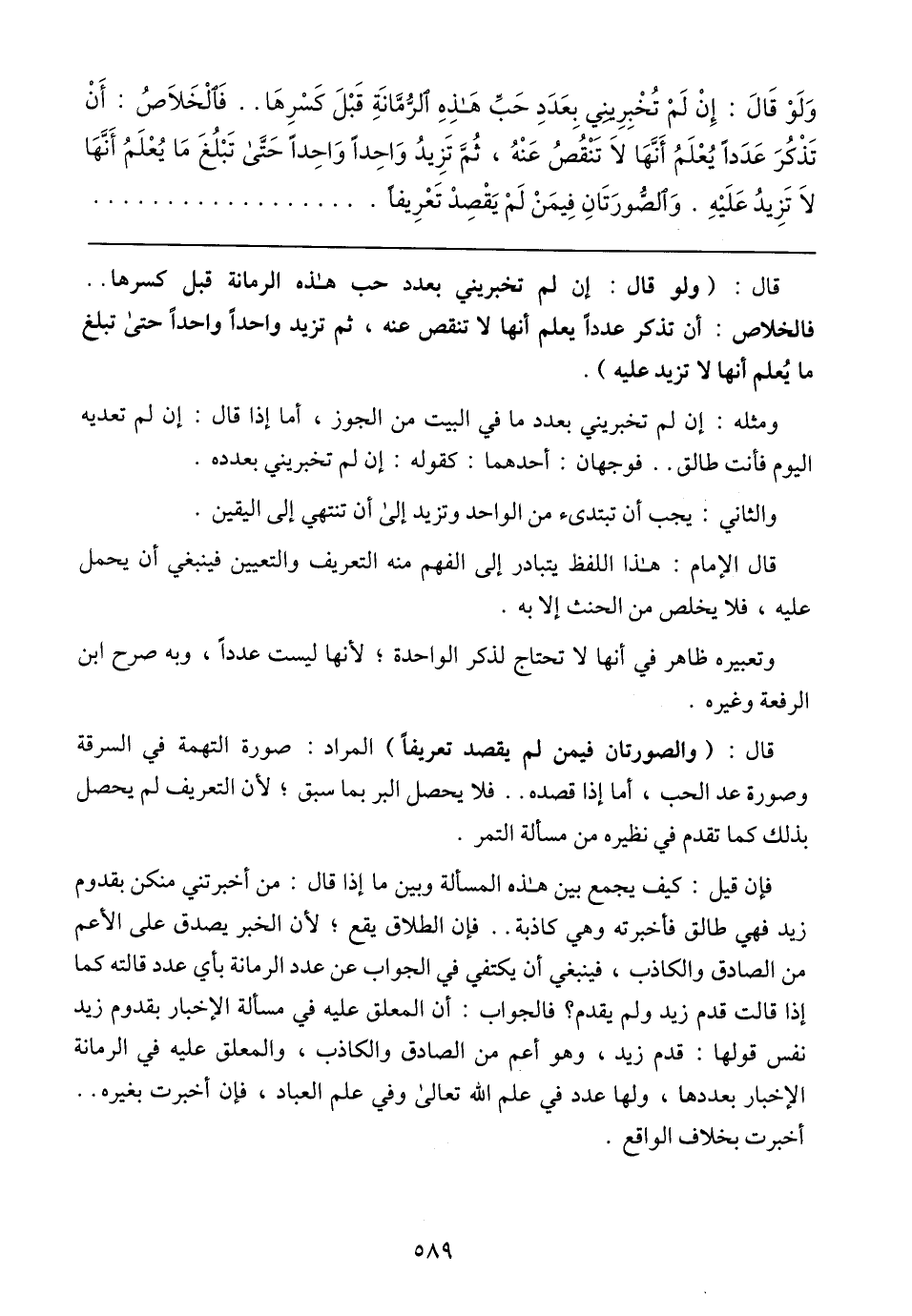 وَلَوْ قَالَ: إِنْ لَمْ تُخْبِرِينِي بِعَدَدِ حَبِّ هَذِهِ الرُّمَّانَةِ قَبْلَ كَسْرِهَا .. فَالْخَلاَصُ: أَنْ تَذْكُرَ عَدَداً يُعْلَمُ أَنَّهَا لاَ تَنْقُصُ عَنْهُ، ثُمَّ تَزِيدُ وَاحِداً وَاحِداً حَتَّى تَبْلُغَ مَا يُعْلَمُ أَنَّهَا لاَ تَزِيدُ عَلَيْهِ. وَالصُّورَتَانِ فِيمَنْ لَمْ يَقْصِدْ تَعْرِيفاً