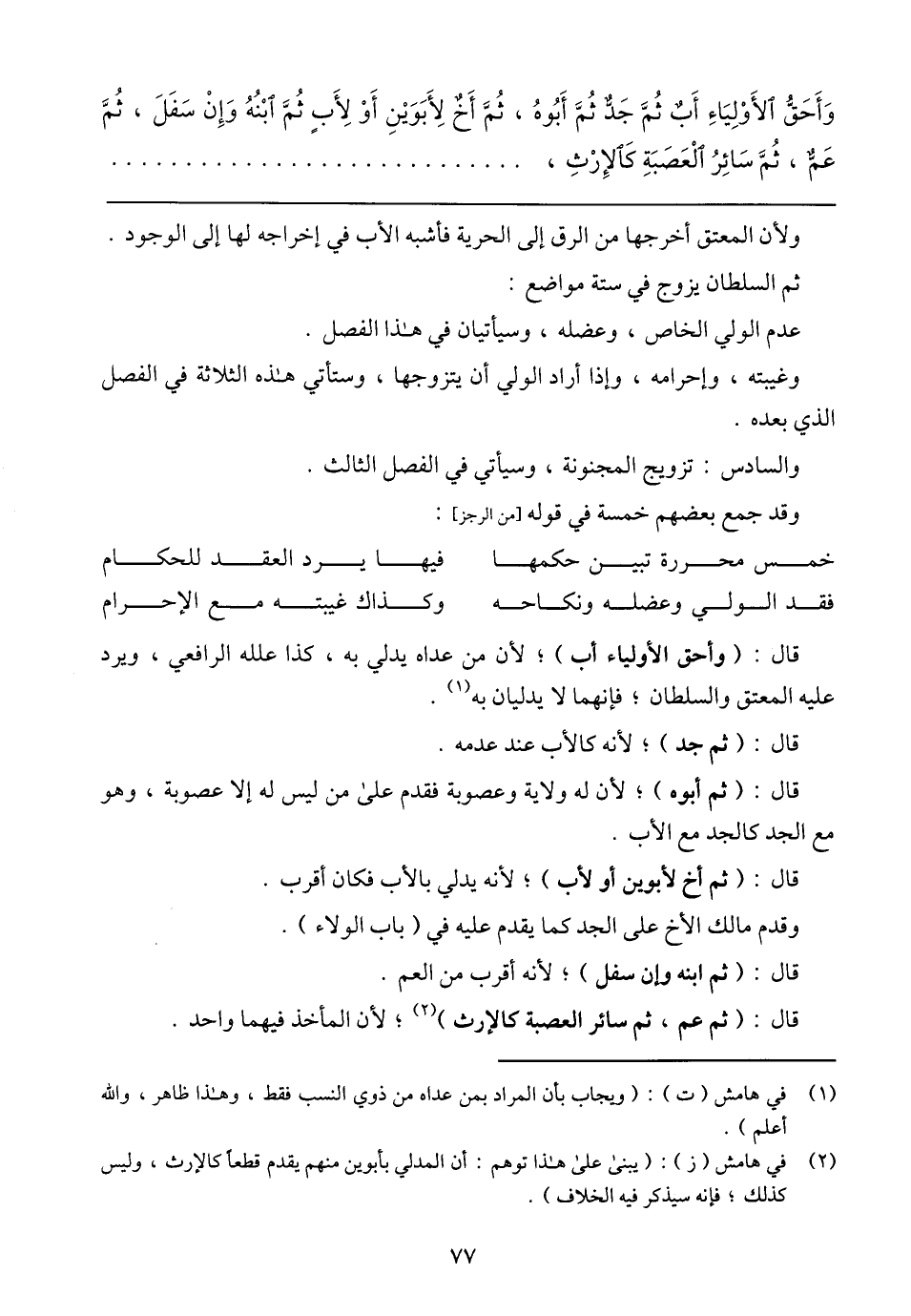 وأَحَقُّ الْأَوْلِيَاءِ أَبُّ ثُمَّ جَدُّ ثُمَّ أَبُوهُ، ثُمَّ أَخُّ لِأَبَوْيْنِ أَوْ لِأَبٍ ثُمَّ ابْنُهُ وَإِنْ سَفَلَ، ثُمَّ عَمِّ، ثُمَّ سَائِرُ الْعَصَبَةِ كَالإِرْثِ،