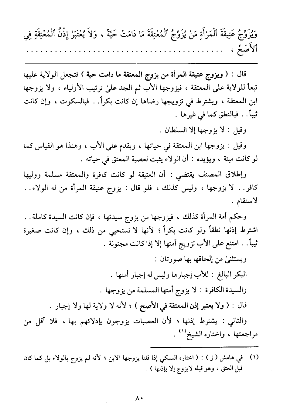 قال: (ويزوج عتيقة المرأة من يزوج المعتقة ما دامت حية) فتجعل الولاية عليها تبعا للولاية على المعتقة، فيزوجها الأب ثم الجد على ترتيب الأولياء، ولا يزوجها ابن المعتقة، ويشترط في تزويجها رضاها إن كانت بكرا .. فالبسكوت، وإن كانت ثيبا .. فالبنطق كما في غيرها.