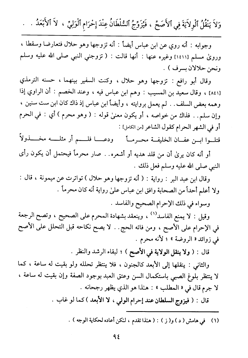 وَلَا يَنْقُلُ الْوِلَايَةَ فِي الْأَصَحِّ، فَيُزَوِّجُ الْسُّلْطَانُ عِنْدَ إِحْرَامِ الْوَلِيِّ، لَا الْأَبْعَدُ