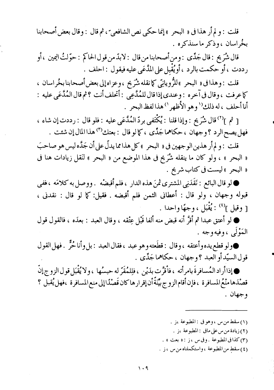 قلت وَلم ار هذَيْن الْوَجْهَيْنِ فِي الْبَحْر كل هَذَا مِمَّا يدل على أَن جده لَيْسَ هُوَ صَاحب الْبَحْر وَلَو كَانَ مَا يَنْقُلهُ شُرَيْح فِي هَذَا الْموضع من الْبَحْر لنقل زيادات هُنَا فِي الْبَحْر لَيست فِي كتاب شُرَيْح