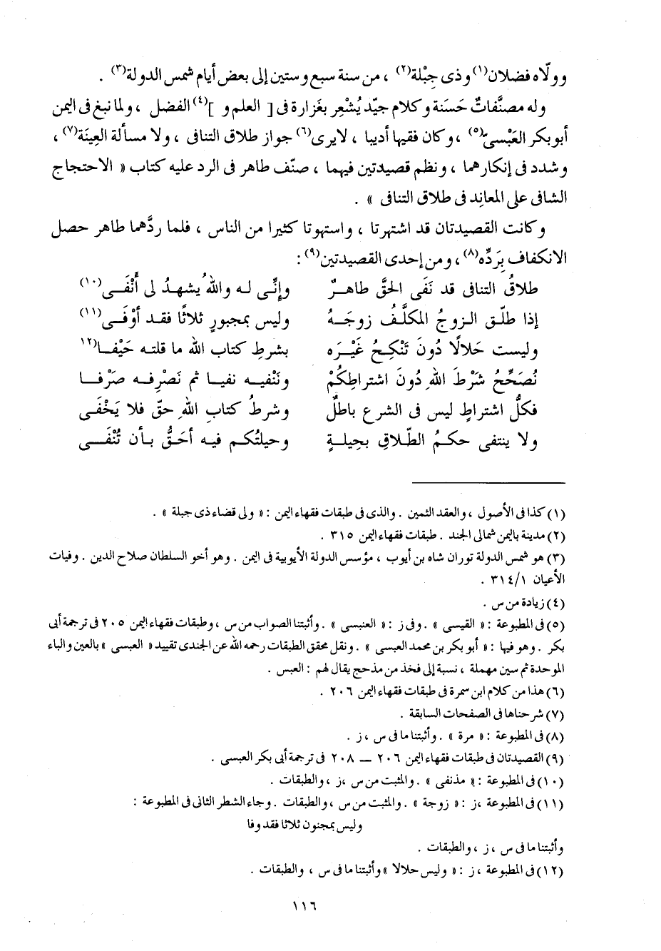 وَله مصنفات حَسَنَة وَكَلَام جيد يشْعر بغزارة فِي الْعلم وَالْفضل وَلما نبغ فِي الْيمن أَبُو بكر الْعَبْسِي وَكَانَ فَقِيها أديبا لَا يرى جَوَاز طَلَاق التَّنَافِي وَلَا مَسْأَلَة الْعينَة وشدد فِي إنكارهما ونظم قصيدتين فيهمَا صنف طَاهِر فِي الرَّد عَلَيْهِ كتاب الِاحْتِجَاج الشافي على المعاند فِي طَلَاق التَّنَافِي