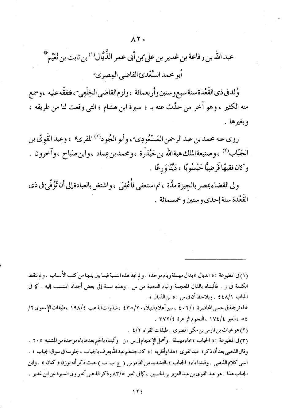 820 - عبد الله بن رِفَاعَة بن غَدِير بن عَليّ بن أبي عمر الذَّيَّال بن ثَابت بن نعيم أَبُو مُحَمَّد السَّعْدِيّ القَاضِي الْمصْرِيّ