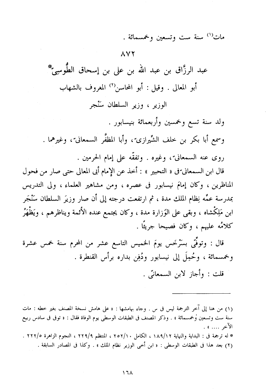 872 - عبد الرَّزَّاق بن عبد الله بن عَليّ بن إِسْحَاق الطوسي أَبُو الْمَعَالِي وَقيل أَبُو المحاسن الْمَعْرُوف بالشهاب الْوَزير وَزِير السُّلْطَان سنجر