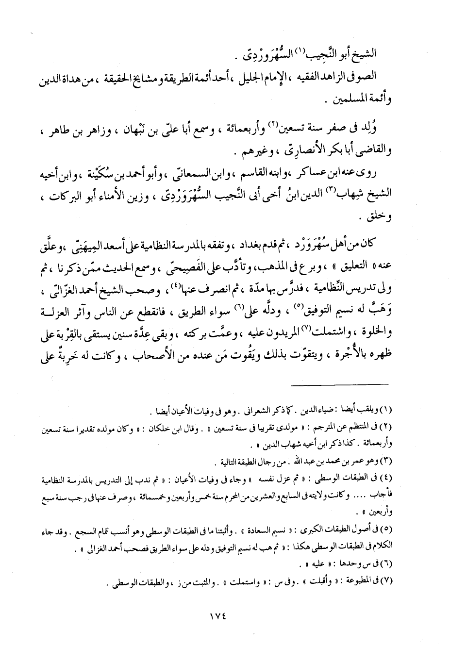 كَانَ من أهل سهرورد ثمَّ قدم بَغْدَاد وتفقه بِالْمَدْرَسَةِ النظامية على أسعد الميهني وعلق عَنهُ التَّعْلِيق وبرع فِي الْمَذْهَب وتأدب على الفصيحي وَسمع الحَدِيث مِمَّن ذكرنَا ثمَّ ولي تدريس النظامية فدرس بهامدة ثمَّ انْصَرف عَنْهَا وَصَحب الشَّيْخ أَحْمد الْغَزالِيّ وهب لَهُ نسيم التَّوْفِيق ودله على سَوَاء الطَّرِيق فَانْقَطع عَن النَّاس وآثر الْعُزْلَة وَالْخلْوَة واشتملت المريدون عَلَيْهِ وعمت بركته وَبَقِي عدَّة سِنِين يَسْتَقِي بالقربة على ظَهره بِالْأُجْرَةِ ويتقوت بذلك ويقوت من عِنْده من الْأَصْحَاب وَكَانَت لَهُ خربة على