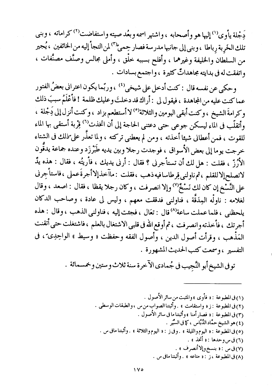وَحكى عَن نَفسه قَالَ كنت أَدخل على شَيْخي وَرُبمَا يكون اعْتَرَانِي بعض الفتور عَمَّا كنت عَلَيْهِ من المجاهدة فَيَقُول لي أَرَاك قد دخلت وَعَلَيْك ظلمَة فَأعْلم سَبَب ذَلِك وكرامة الشَّيْخ وَكنت أبقى الْيَوْمَيْنِ وَالثَّلَاثَة لَا أستطعم بزاد وَكنت أنزل إِلَى دجلة وأتقلب فِي المَاء ليسكن جوعى حَتَّى دعتني الْحَاجة إِلَى أَن اتَّخذت قربَة أستقي بهَا المَاء للقوت فَمن أَعْطَانِي شَيْئا أَخَذته وَمن لم يُعْطِنِي تركته وَلما تعذر عَليّ ذَلِك فِي الشتَاء خرجت يَوْمًا إِلَى بعض الْأَسْوَاق فَوجدت رجلا وَبَين يَدَيْهِ طبرزد وَعِنْده جمَاعَة يدقون الْأرز فَقلت هَل لَك أَن تستأجرني فَقَالَ أَرِنِي يَديك فأريته فَقَالَ هَذِه يَد لَا تصلح إِلَّا للقلم ثمَّ ناولني قرطاسا فِيهِ ذهب فَقلت مَا آخذ إِلَّا أُجْرَة عَمَلي فاستأجرني على النّسخ إِن كَانَ لَك نسخ وَإِلَّا انصرفت وَكَانَ رجلا يقظا فَقَالَ اصْعَدْ وَقَالَ لغلامه نَاوَلَهُ المدقة فناولني فدققت مَعَهم وَلَيْسَ لي عَادَة وَصَاحب الدّكان يلحظني فَلَمَّا عملت سَاعَة قَالَ تعال فَجئْت إِلَيْهِ فناولني الذَّهَب وَقَالَ هَذِه أجرتك فَأَخَذته وانصرفت ثمَّ أوقع الله فِي قلبِي الِاشْتِغَال بِالْعلمِ فاشتغلت حَتَّى أتقنت الْمَذْهَب وقرأت أصُول الدّين وأصول الْفِقْه وحفظت وسيط الواحدي فِي التَّفْسِير وَسمعت كتب الحَدِيث الْمَشْهُورَة