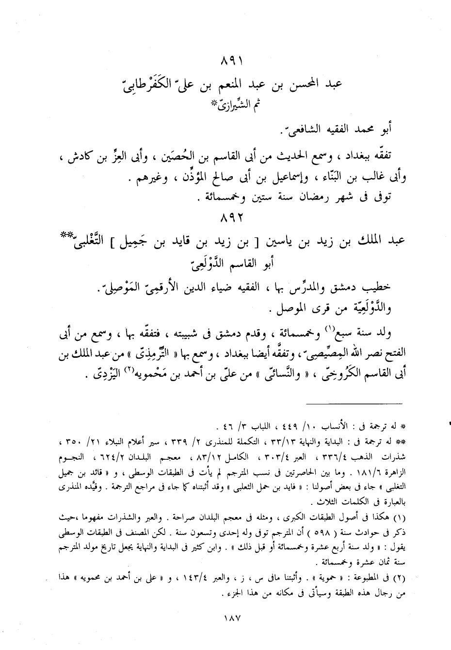 891 - عبد المحسن بن عبد الْمُنعم بن عَليّ الكفرطابي ثمَّ الشِّيرَازِيّ أَبُو مُحَمَّد الْفَقِيه الشَّافِعِي