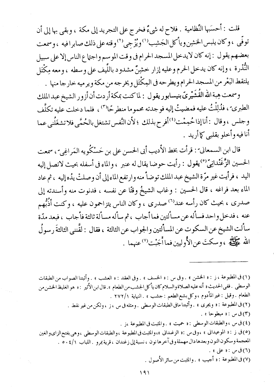 وَسمعت هبة الله الْقشيرِي بنيسابور يَقُول لما كنت بِمَكَّة أردْت أَن أَزور الشَّيْخ عبد الْملك الطَّبَرِيّ فدللت إِلَيْهِ فمضيت عَلَيْهِ فَوَجَدته محموما منطرحا فلمادخلت عَلَيْهِ تكلّف وَجلسَ وَقَالَ أَنا إِذا حممت أفرح بذلك لِأَن النَّفس تشتغل بالحمى فَلَا تشغلني عَمَّا أَنا فِيهِ وأخلو بقلبي كَمَا أُرِيد