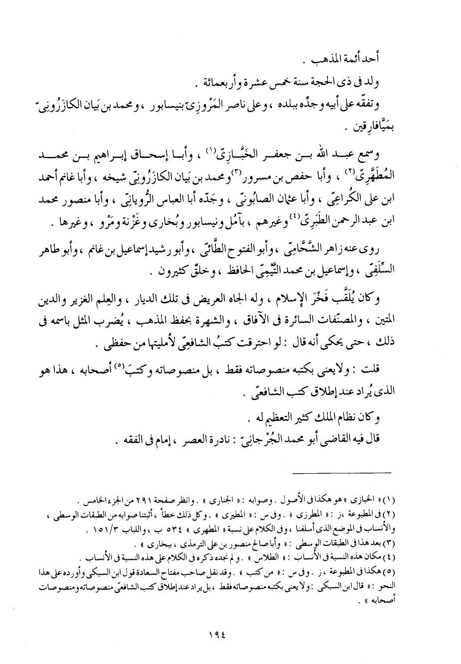 وتفقه على أَبِيه وجده بِبَلَدِهِ وعَلى نَاصِر الْمروزِي بنيسابور وَمُحَمّد بن بَيَان الكازروني بميافارقين