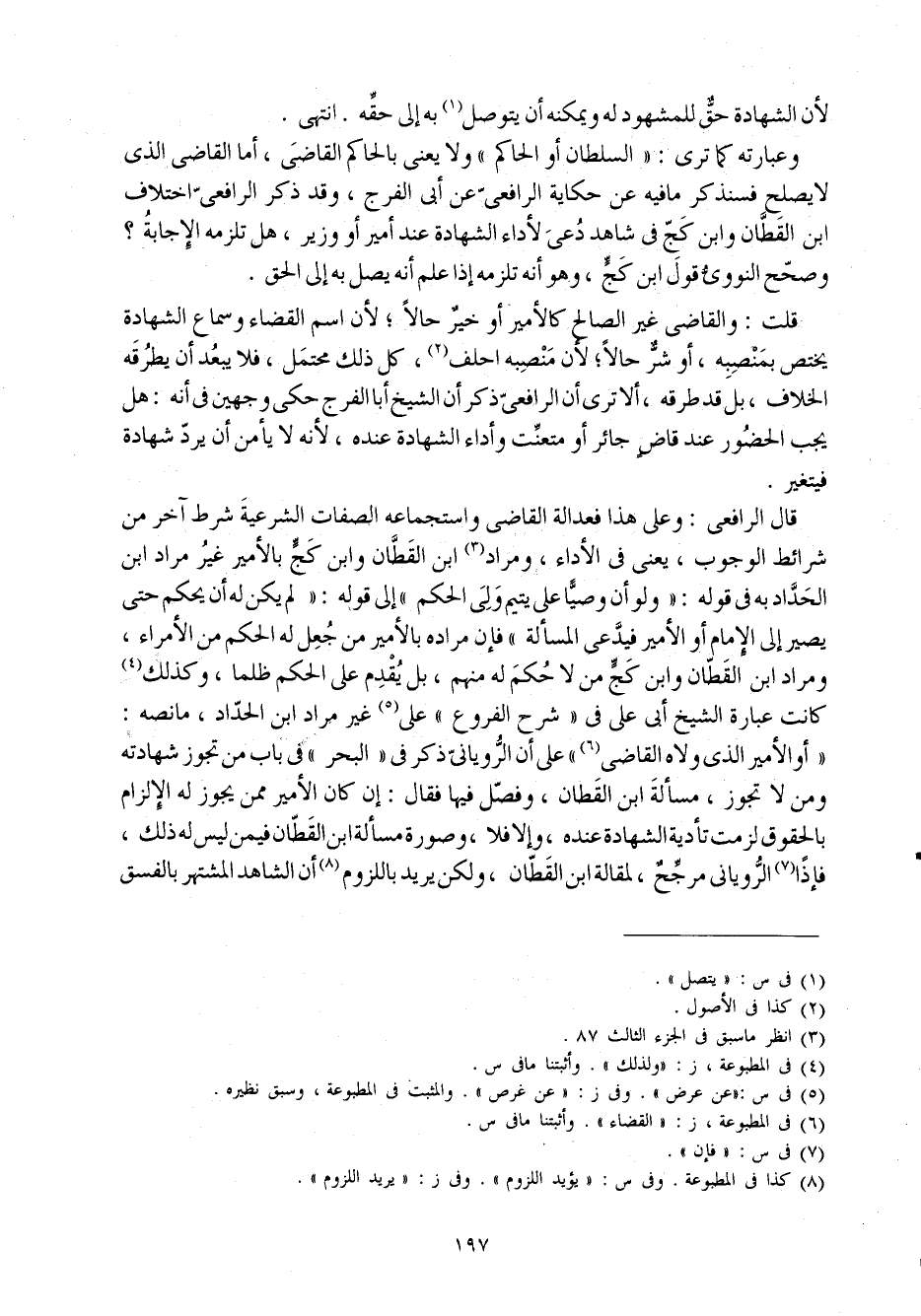 قَالَ الرَّافِعِيّ وعَلى هَذَا فعداله القَاضِي واستجماعه الصِّفَات الشَّرْعِيَّة شَرط آخر من شَرَائِط الْوُجُوب يَعْنِي فِي الْأَدَاء وَمُرَاد ابْن الْقطَّان وَابْن كج بالأمير غير مُرَاد ابْن الْحداد بِهِ فِي قَوْله وَلَو أَن وَصِيّا على يَتِيم ولي الحكم إِلَى قَوْله لم يكن لَهُ أَن يحكم حَتَّى يصير إِلَى الإِمَام أَو الْأَمِير فيدعي الْمَسْأَلَة فَإِن مُرَاده بالأمير من جعل لَهُ الحكم من الْأُمَرَاء وَمُرَاد ابْن الْقطَّان وَابْن كج من لَا حكم لَهُ مِنْهُم بل يقدم على الحكم ظلما وَكَذَلِكَ كَانَت عبارَة الشَّيْخ أبي عَليّ فِي شرح الْفُرُوع على غير مُرَاد ابْن الْحداد مَا نَصه أَو الْأَمِير الَّذِي ولاه القَاضِي على أَن الرَّوْيَانِيّ ذكر فِي الْبَحْر فِي بَاب من تجوز شَهَادَته وَمن لَا تجوز مَسْأَلَة ابْن الْقطَّان وَفصل فِيهَا فَقَالَ إِن كَانَ الْأَمِير مِمَّن يجوز لَهُ الْإِلْزَام بالحقوق لَزِمت تأدية الشَّهَادَة عِنْده والإ فَلَا وَصُورَة مَسْأَلَة ابْن الْقطَّان فِيمَن لَيْسَ لَهُ ذَلِك فَإِذا الرَّوْيَانِيّ مُرَجّح لمقالة ابْن الْقطَّان وَلَكِن يُرِيد باللزوم أَن الشَّاهِد المشتهر بِالْفِسْقِ