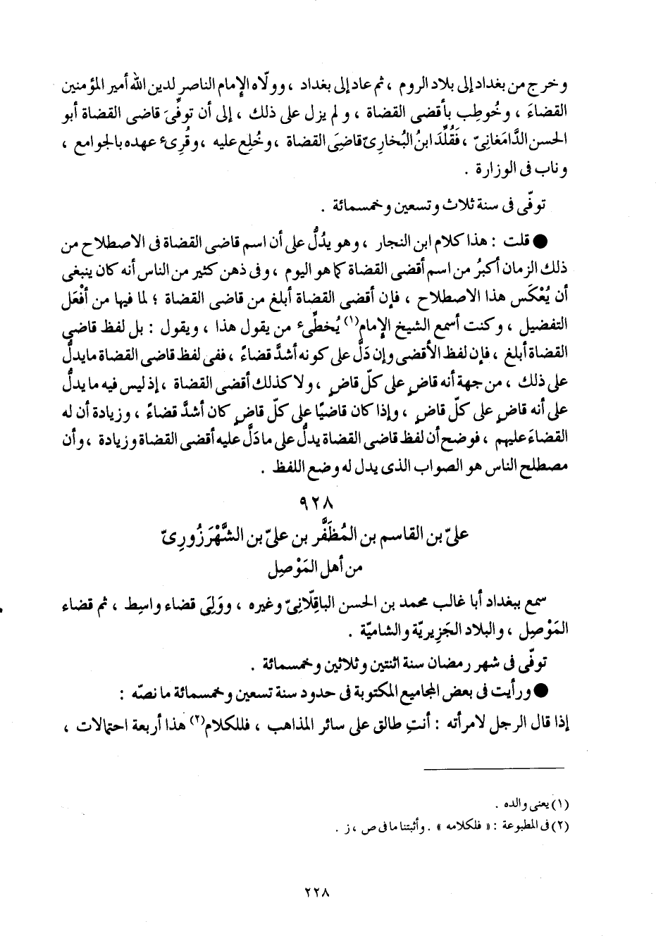 قلت هَذَا كَلَام ابْن النجار وَهُوَ يدل على أَن اسْم قَاضِي الْقُضَاة فِي الِاصْطِلَاح من ذَلِك الزَّمَان أكبر من اسْم أقضى الْقُضَاة كَمَا هُوَ الْيَوْم وَفِي ذهن كثير من النَّاس أَنه كَانَ يَنْبَغِي أَن يعكس هَذَا الِاصْطِلَاح فَإِن أقضى الْقُضَاة أبلغ من قَاضِي الْقُضَاة لما فِيهَا من أفعل التَّفْضِيل وَكتب أسمع الشَّيْخ الإِمَام يخطىء من يَقُول هَذَا وَيَقُول بل لفظ قَاضِي الْقُضَاة أبلغ فَإِن لفظ الأقضى وَإِن دلّ على كَونه أَشد قَضَاء فَفِي لفظ قَاضِي الْقُضَاة مَا يدل على ذَلِك من جِهَة أَنه قَاض على كل قَاض وَلَا كَذَلِك أقضى الْقُضَاة إِذْ لَيْسَ فِيهِ مَا يدل على أَنه قَاض على كل قَاض وَإِذا كَانَ قَاضِيا على كل قَاض كَانَ أَشد قَضَاء وَزِيَادَة أَن لَهُ الْقَضَاء عَلَيْهِم فوضح أَن لفظ قَاضِي الْقُضَاة يدل على مَا دلّ عَلَيْهِ أقضى الْقُضَاة وَزِيَادَة وَأَن مصطلح النَّاس هُوَ الصَّوَاب الَّذِي يدل لَهُ وضع اللَّفْظ