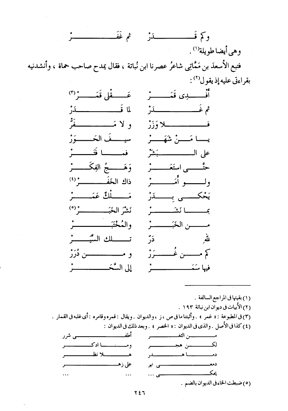 فتبع الأسعد بن مماتي شَاعِر عصرنا ابْن نباتة فَقَالَ يمدح صَاحب حماة وأنشدنيه بِقِرَاءَتِي عَلَيْهِ إِذْ يَقُول