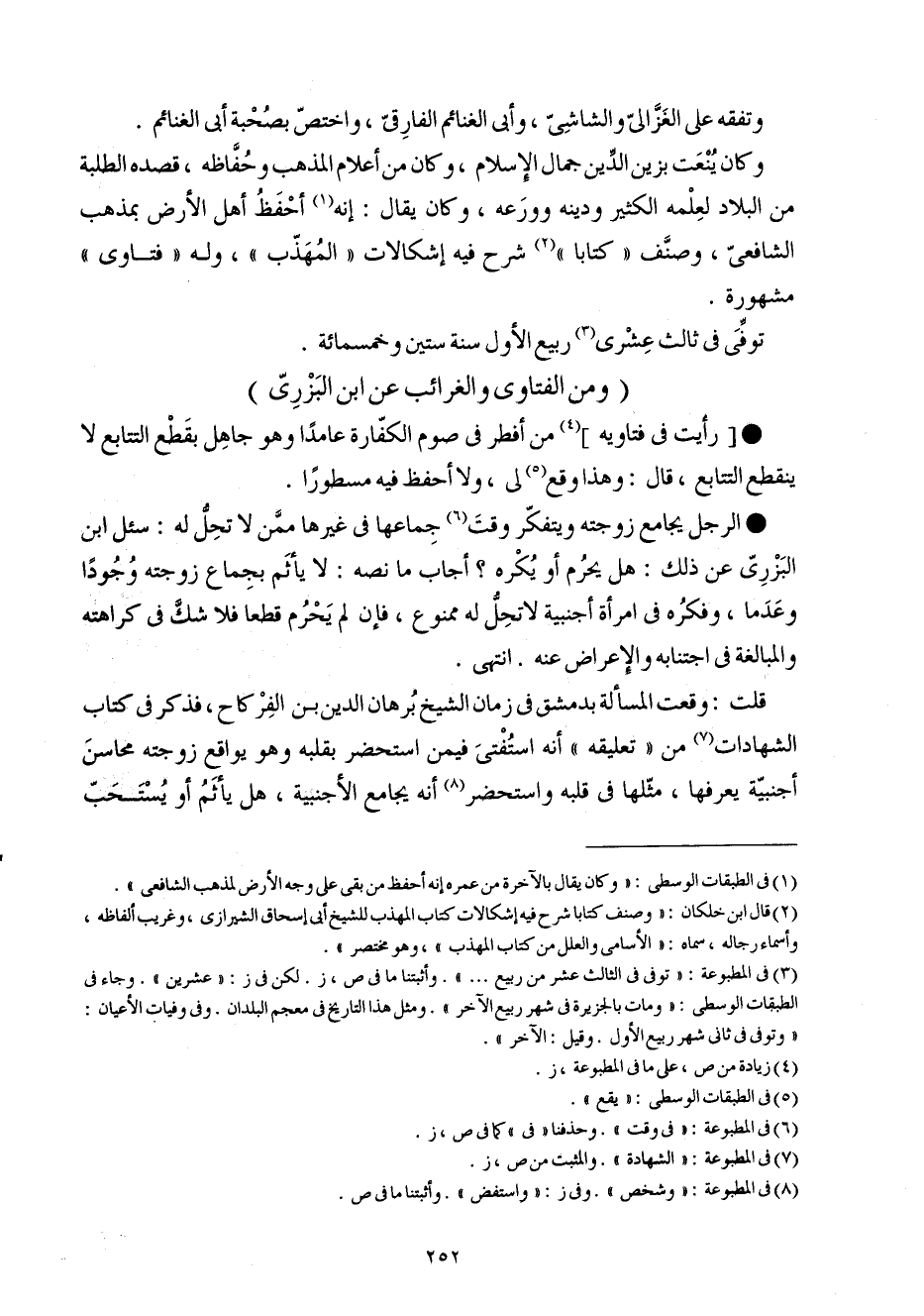 وَكَانَ ينعَت بزين الدّين جمال الْإِسْلَام وَكَانَ من أَعْلَام الْمَذْهَب وحفاظه قَصده الطّلبَة من الْبِلَاد لعلمه الْكثير وَدينه وورعه وَكَانَ يُقَال إِنَّه أحفظ أهل الأَرْض بِمذهب الشَّافِعِي وصنف كتابا شرح فِيهِ إشكالات الْمُهَذّب وَله فَتَاوَى مَشْهُورَة