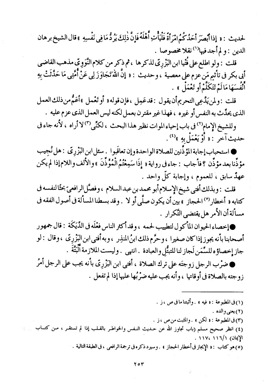 قلت وَلَو اطلع على فتيا ابْن البزري لذكرها ثمَّ ذكر من كَلَام النَّوَوِيّ مَذْهَب القَاضِي أبي بكر فِي تأثيم من عزم على مَعْصِيّة وَحَدِيث إِن الله تجَاوز لي عَن أمتِي مَا حدثت بِهِ أَنْفسهَا مَا لم تَتَكَلَّم أَو تعْمل