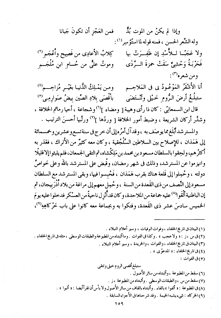 والمسترشد أبلغ مِمَّا يُوصف بِهِ وَقد آل أمره إِلَى أَن خرج فِي سنة تسع وَعشْرين وَخَمْسمِائة إِلَى همذان للإصلاح بَين السلاطين السلجقية وَكَانَ مَعَه كثير من الأتراك فغدر بِهِ أَكْثَرهم وَلَحِقُوا بالسلطان مَسْعُود بن مُحَمَّد بن ملكشاة ثمَّ التقى الْجَمْعَانِ فَلم يَلْبَثُوا إِلَّا قَلِيلا وانهزموا عَن المسترشد وَذَلِكَ فِي شهر رَمَضَان وَقبض على المسترشد بِاللَّه وعَلى خَواص دولته وحملوا إِلَى قلعة هُنَاكَ بِقرب همذان فحبسوا فِيهَا وَبَقِي المسترشد مَعَ السُّلْطَان مَسْعُود إِلَى النّصْف من ذِي الْقعدَة من السّنة وَحمل مَعَهم إِلَى مراغة من بِلَاد أذربيجان ثمَّ إِن الباطنية ألقوا عَلَيْهِ جمَاعَة من الْمَلَاحِدَة وَكَانَ قد أنزل نَاحيَة من الْعَسْكَر فَدَخَلُوا عَلَيْهِ يَوْم الْخَمِيس سادس عشر ذِي الْقعدَة وفتكوا بِهِ وبجماعة مَعَه كَانُوا على بَاب خر كاهه