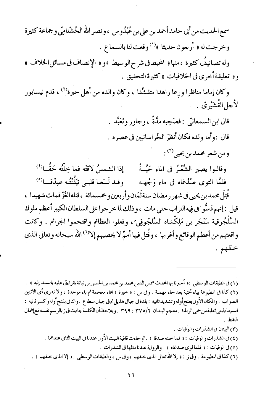قتل مُحَمَّد بن يحيى فِي شهر رَمَضَان سنة ثَمَان وَأَرْبَعين وَخَمْسمِائة قَتله الغز فَمَاتَ شَهِيدا قيل إِنَّهُم دسوا فِي فِيهِ التُّرَاب حَتَّى مَاتَ وَذَلِكَ لما خَرجُوا على السُّلْطَان الْكَبِير أعظم مُلُوك السلجوقية سنجر بن ملكشاه السلجوقي وفعلوا العظائم واقتحموا الجرائم
