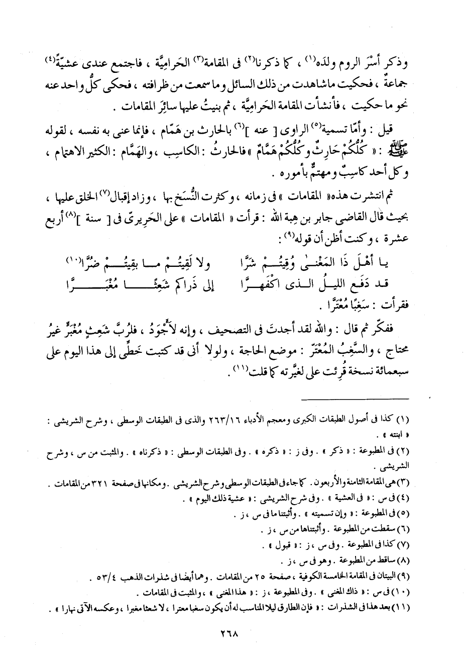 وَذكر اسر الرّوم وَلَده كَمَا ذكرنَا فِي المقامة الحرامية فَاجْتمع عِنْدِي عَشِيَّة جمَاعَة فحكيت مَا شاهدت من ذَلِك السَّائِل وَمَا سَمِعت من ظرافته فحكي كل وَاحِد عَنهُ نَحْو مَا حكيت فأنشات المقامة الحرامية ثمَّ بنيت عَلَيْهَا سَائِر المقامات