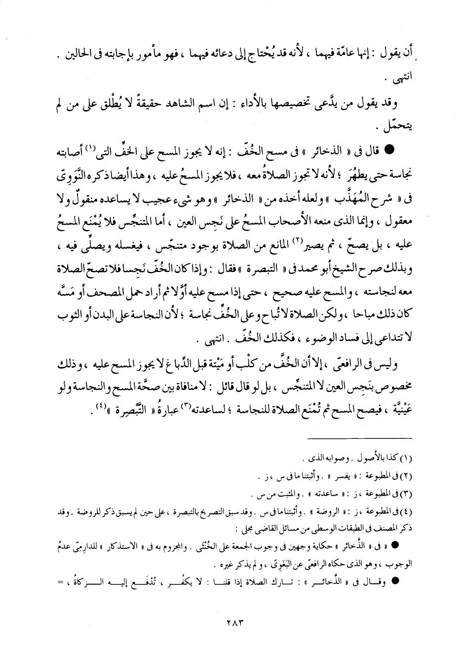 قَالَ فِي الذَّخَائِر فِي مسح الْخُف أَنه لَا يجوز الْمسْح على الْخُف الَّتِي أَصَابَته نَجَاسَة حَتَّى يطهر لِأَنَّهُ لَا تجوز الصَّلَاة مَعَه فَلَا يجوز الْمسْح عَلَيْهِ وَهَذَا أَيْضا ذكره النَّوَوِيّ فِي شرح الْمُهَذّب وَلَعَلَّه أَخذه من الذَّخَائِر وَهُوَ شَيْء عَجِيب لَا يساعده مَنْقُول وَلَا مَعْقُول وَإِنَّمَا الَّذِي مَنعه الْأَصْحَاب الْمسْح على نجس الْعين أم الْمُتَنَجس فَلَا يمْنَع الْمسْح عَلَيْهِ بل يَصح ثمَّ يصير الْمَانِع من الصَّلَاة بِوُجُود مُتَنَجّس فيغسله وَيُصلي فِيهِ وَبِذَلِك صرح الشَّيْخ أَبُو مُحَمَّد فِي التَّبْصِرَة فَقَالَ وَإِذا كَانَ الْخُف نجسا فَلَا تصح الصَّلَاة مَعَه لنجاسته وَالْمسح عَلَيْهِ صَحِيح حَتَّى إِذا مسح عَلَيْهِ أَولا ثمَّ أَرَادَ حمل الْمُصحف أومسه كَانَ ذَلِك مُبَاحا وَلَكِن الصَّلَاة لَا تُبَاح وعَلى الْخُف نَجَاسَة لِأَن النَّجَاسَة على الْبدن أَو الثَّوْب لَا تتداعى إِلَى فَسَاد الْوضُوء فَكَذَلِك الْخُف انْتهى