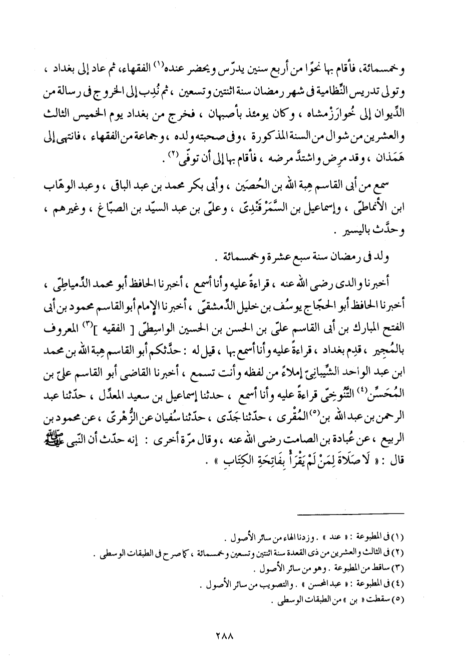 أخبرنَا وَالِدي رَضِي الله عَنهُ قِرَاءَة عَلَيْهِ وَأَنا أسمع أخبرنَا الْحَافِظ أَبُو مُحَمَّد الدمياطي أخبرنَا الْحَافِظ أَبُو الْحجَّاج يُوسُف بن خَلِيل الدِّمَشْقِي أخبرنَا الإِمَام أَبُو الْقَاسِم مَحْمُود بن أبي الْفَتْح الْمُبَارك بن أبي الْقَاسِم عَليّ بن الْحسن بن الْحُسَيْن الوَاسِطِيّ الْفَقِيه الْمَعْرُوف بالمجير قدم بَغْدَاد قِرَاءَة عَلَيْهِ وَأَنا أسمع بهَا قيل لَهُ حَدثكُمْ أَبُو الْقَاسِم هبة الله بن مُحَمَّد ابْن عبد الْوَاحِد الشَّيْبَانِيّ إملاء من لَفظه وَأَنت تسمع أخبرنَا القَاضِي أَبُو الْقَاسِم عَليّ بن المحسن التنوخي قِرَاءَة عَلَيْهِ وَأَنا أسمع حَدثنَا إِسْمَاعِيل بن سعيد الْمعدل حَدثنَا عبد الرَّحْمَن بن عبد الله بن الْمقري حَدثنَا جدي حَدثنَا سُفْيَان عَن الزُّهْرِيّ عَن مَحْمُود بن الرّبيع عَن عبَادَة بن الصَّامِت رَضِي الله عَنهُ وَقَالَ مرّة أُخْرَى إِنَّه حدث أَن النَّبِي صلى الله عَلَيْهِ وَسلم قَالَ لَا صَلَاة لمن لم يقْرَأ بِفَاتِحَة الْكتاب