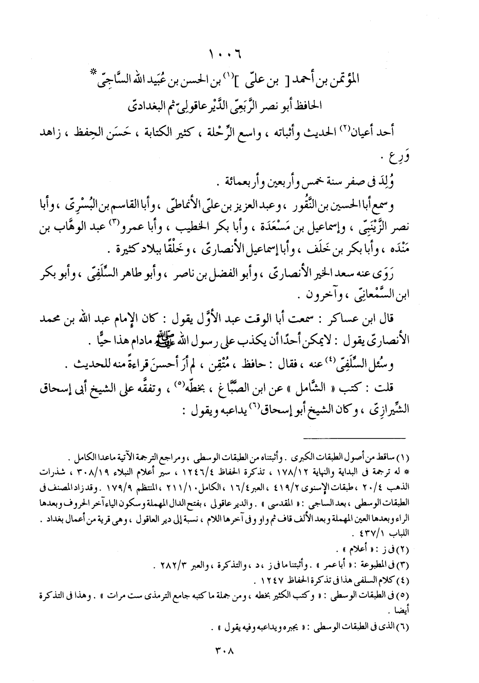 1006 - المؤتمن بن أَحْمد بن عَليّ بن الْحسن بن عبيد الله السَّاجِي الْحَافِظ أَبُو نصر الربعِي الدَّيْر عاقولي ثمَّ الْبَغْدَادِيّ