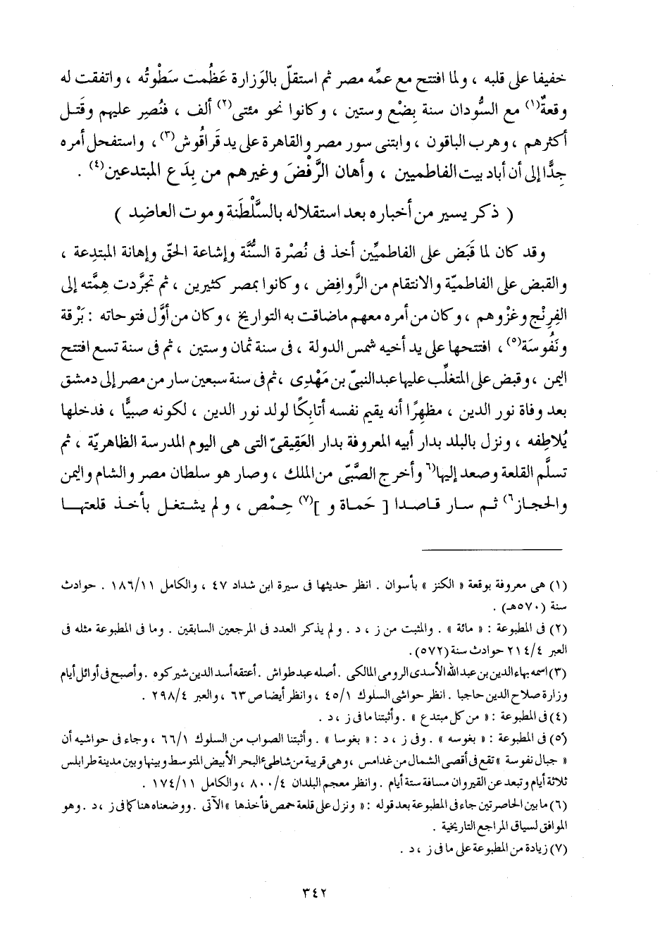 خَفِيفا على قلبه وَلما افْتتح مَعَ عَمه مصر ثمَّ اسْتَقل بالوزارة عظمت سطوته واتفقت لَهُ وقْعَة مَعَ السودَان سنة بضع وَسِتِّينَ وَكَانُوا نَحْو مئتي ألف فنصر عَلَيْهِم وَقتل أَكْثَرهم وهرب الْبَاقُونَ وابنتي سور مصر والقاهرة على يَد قراقوش واستفحل أمره جدا إِلَى أَن أباد بَيت الفاطميين وأهان الرَّفْض وَغَيرهم من بدع المبتدعين