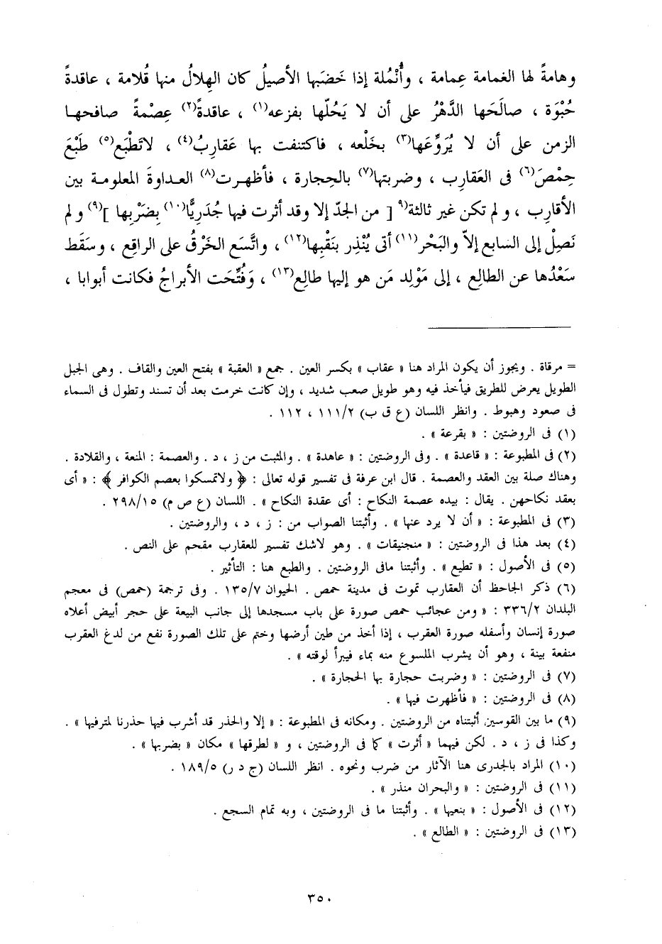 وَهَامة لَهَا الغمامة عِمَامَة وأنملة إِذا خضبها الْأَصِيل كَانَ الْهلَال مِنْهَا قلامة عاقدة حبوة صالحها الدَّهْر على أَن لَا يحلهَا بفزعه عاقدة عصمَة صافحها الزَّمن على أَن لَا يروعها بخلعة فاكتنفت بهَا عقارب لَا تطبع طبع حمص فِي العقارب وضربتها بِالْحِجَارَةِ فأظهرت الْعَدَاوَة الْمَعْلُومَة بَين الْأَقَارِب وَلم تكن غير ثالثه من الْجد إِلَّا وَقد أثرت فِيهَا جدريا بضربها وَلم نصل إِلَى السَّابِع إِلَّا وَالْبَحْر أَتَى ينذر بنقبها واتسع الْخرق على الراقع وَسقط سعدها عَن الطالع إِلَى مولد من هُوَ إِلَيْهَا طالع وَفتحت الأبراج فَكَانَت أبوابا