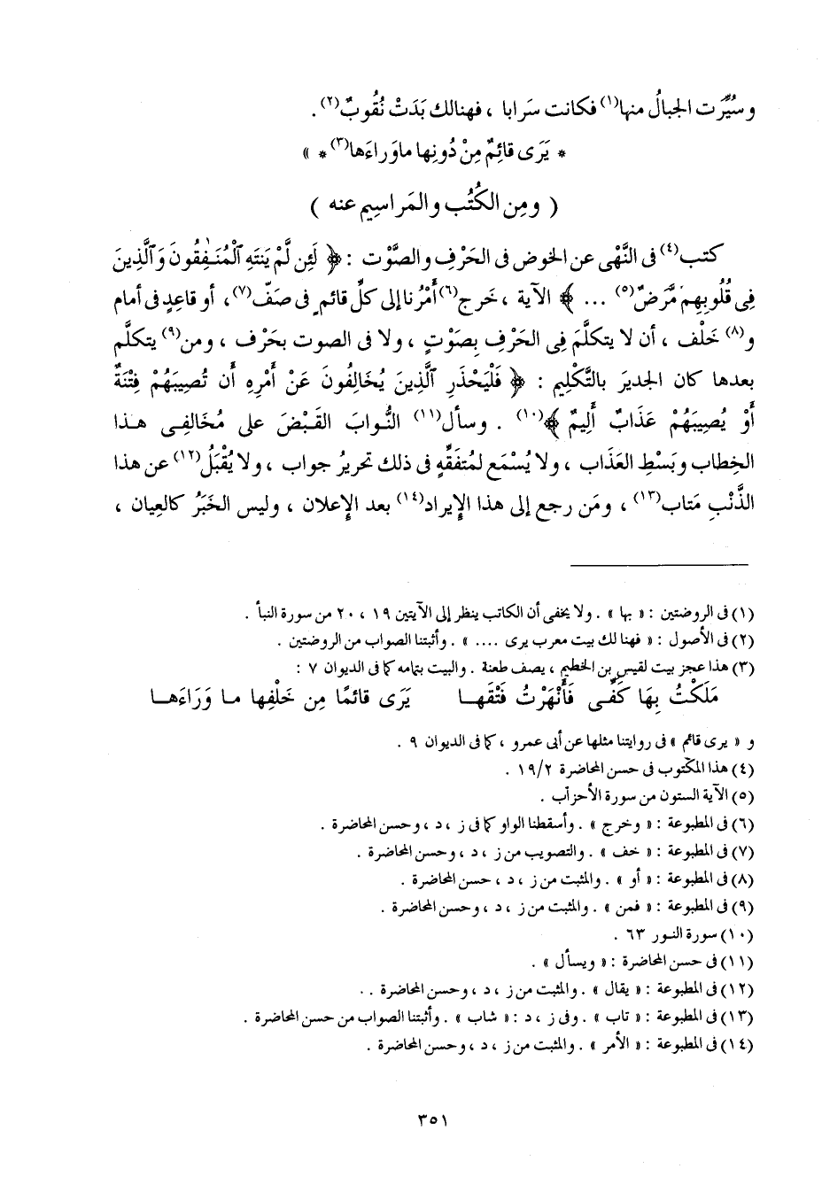 كتب فِي النَّهْي عَن الْخَوْض فِي الْحَرْف وَالصَّوْت {لَئِن لم ينْتَه المُنَافِقُونَ وَالَّذين فِي قُلُوبهم مرض} الْآيَة خرج أمرنَا إِلَى كل قَائِم فِي صف أَو قَاعد فِي أَمَام وَخلف أَن لَا يتَكَلَّم فِي الْحَرْف بِصَوْت وَلَا فِي الصَّوْت بِحرف وَمن يتَكَلَّم بعْدهَا كَانَ الجدير بالتكليم {فليحذر الَّذين يخالفون عَن أمره أَن تصيبهم فتْنَة أَو يصيبهم عَذَاب أَلِيم}