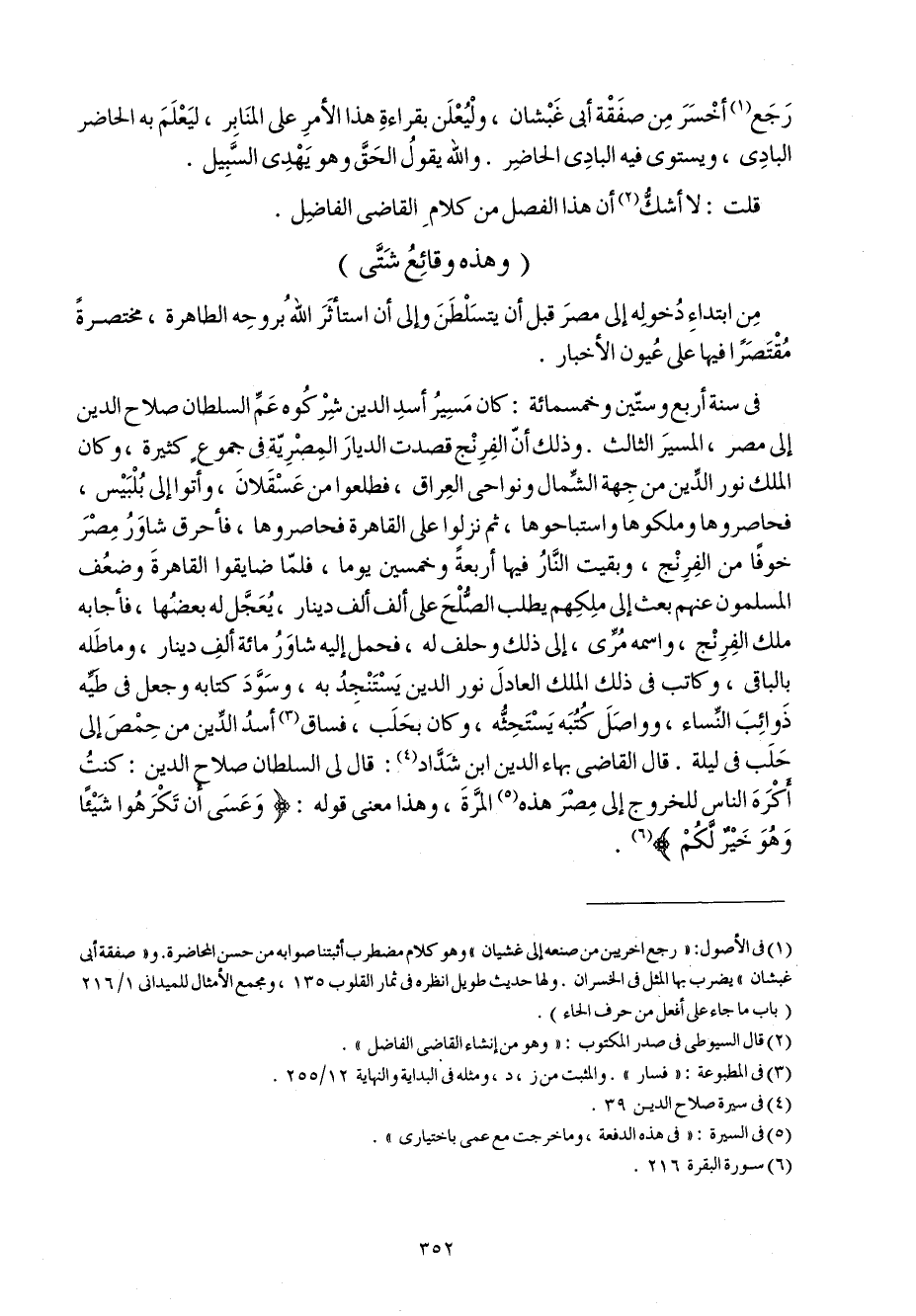 قَالَ القَاضِي بهاء الدّين ابْن شَدَّاد قَالَ لي السُّلْطَان صَلَاح الدّين كنت أكره النَّاس لِلْخُرُوجِ إِلَى مصر هَذِه الْمرة وَهَذَا معنى قَوْله {وَعَسَى أَن تكْرهُوا شَيْئا وَهُوَ خير لكم}