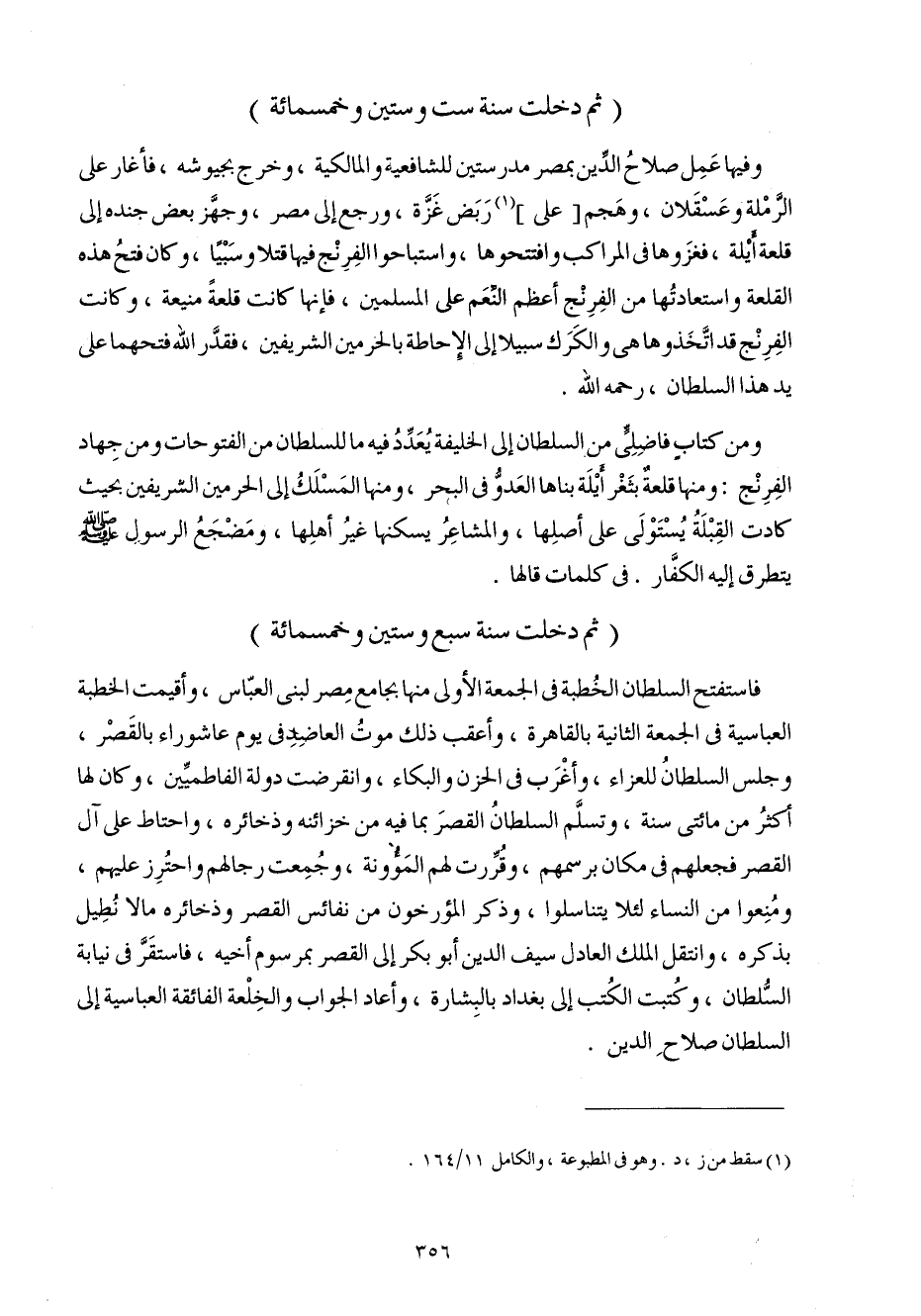 وَمن كتاب فاضلي من السُّلْطَان إِلَى الْخَلِيفَة يعدد فِيهِ مَا للسُّلْطَان من الفتوحات وَمن جِهَاد الفرنج وَمِنْهَا قلعة بثغر أَيْلَة بناها الْعَدو فِي الْبَحْر وَمِنْهَا المسلك إِلَى الْحَرَمَيْنِ الشريفين بِحَيْثُ كَادَت الْقبْلَة يستولي على أَصْلهَا والمشاعر يسكنهَا غير أَهلهَا ومضجع الرَّسُول صلى الله عَلَيْهِ وَسلم يتَطَرَّق إِلَيْهِ الْكفَّار