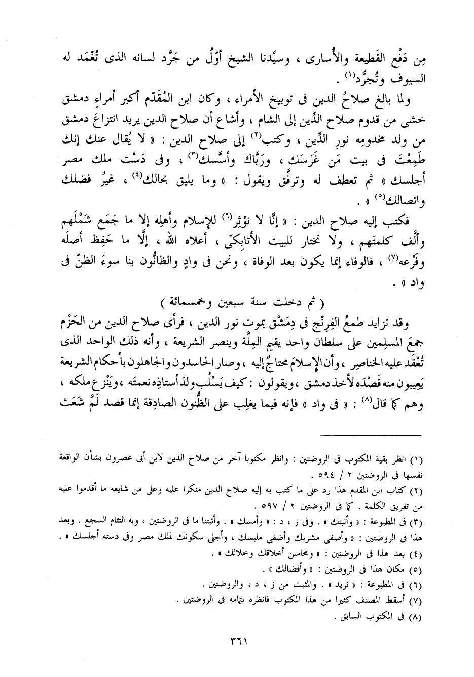 فَكتب إِلَيْهِ صَلَاح الدّين إِنَّا لَا نؤثر لِلْإِسْلَامِ وَأَهله إِلَّا مَا جمع شملهم وَألف كلمتهم وَلَا نَخْتَار للبيت الأتابكي أَعْلَاهُ الله إِلَّا مَا حفظ أَصله وفرعه فالوفاء إِنَّمَا يكون بعد الْوَفَاة وَنحن فِي وَاد والظانون بِنَا سوء الظَّن فِي وَاد