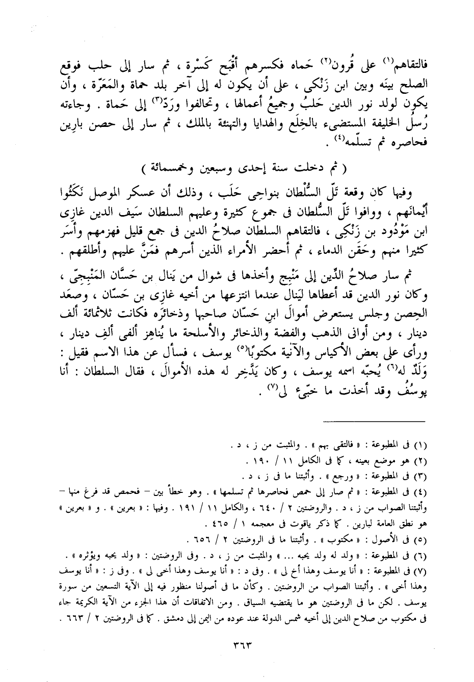 وفيهَا كَانَ وقْعَة تل السُّلْطَان بنواحي حلب وَذَلِكَ أَن عَسْكَر الْموصل نكثوا أَيْمَانهم ووافوا تل السُّلْطَان فِي جموع كَثِيرَة وَعَلَيْهِم السُّلْطَان سيف الدّين غَازِي ابْن مودود بن زنكي فالتقاهم السُّلْطَان صَلَاح الدّين فِي جمع قَلِيل فَهَزَمَهُمْ وَأسر كثيرا مِنْهُم وحقن الدِّمَاء ثمَّ أحضر الْأُمَرَاء الَّذين أسرهم فَمن عَلَيْهِم وأطلقهم