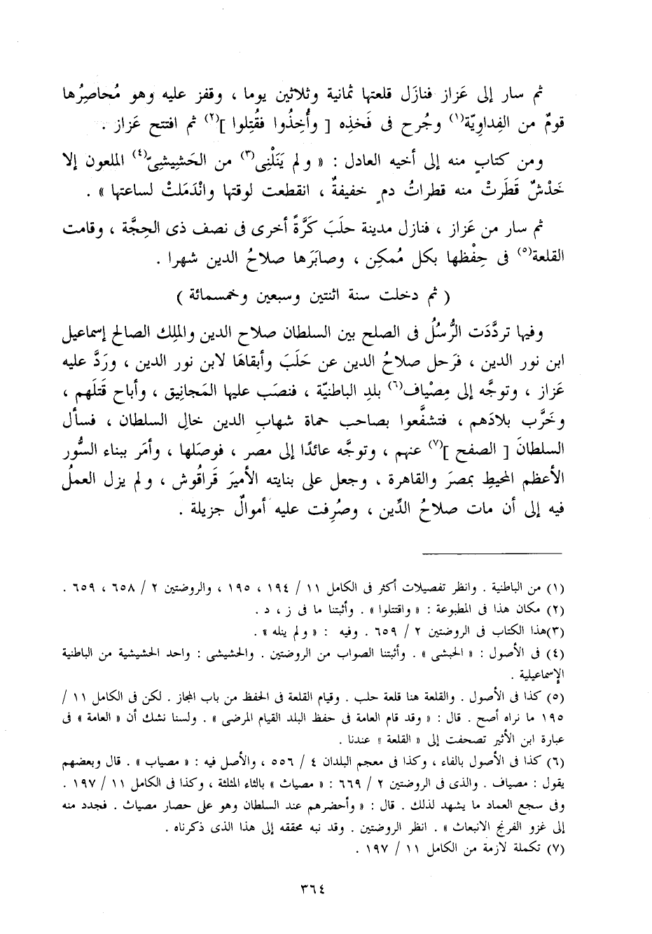 وفيهَا ترددت الرُّسُل فِي الصُّلْح بَين السُّلْطَان صَلَاح الدّين وَالْملك الصَّالح إِسْمَاعِيل ابْن نور الدّين فَرَحل صَلَاح الدّين عَن حلب وأبقاها لِابْنِ نور الدّين ورد عَلَيْهِ عزاز وَتوجه إِلَى مصياف بلد الباطنية فنصب عَلَيْهَا المجانيق وأباح قَتلهمْ وَخرب بِلَادهمْ فتشفعوا بِصَاحِب حماة شهَاب الدّين خَال السُّلْطَان فَسَأَلَ السُّلْطَان الصفح عَنْهُم وَتوجه عَائِدًا إِلَى مصر فوصلها وَأمر بِبِنَاء السُّور الْأَعْظَم الْمُحِيط بِمصْر والقاهرة وَجعل على بنايته الْأَمِير قراقوش وَلم يزل الْعَمَل فِيهِ إِلَى أَن مَاتَ صَلَاح الدّين وصرفت عَلَيْهِ أَمْوَال جزيلة