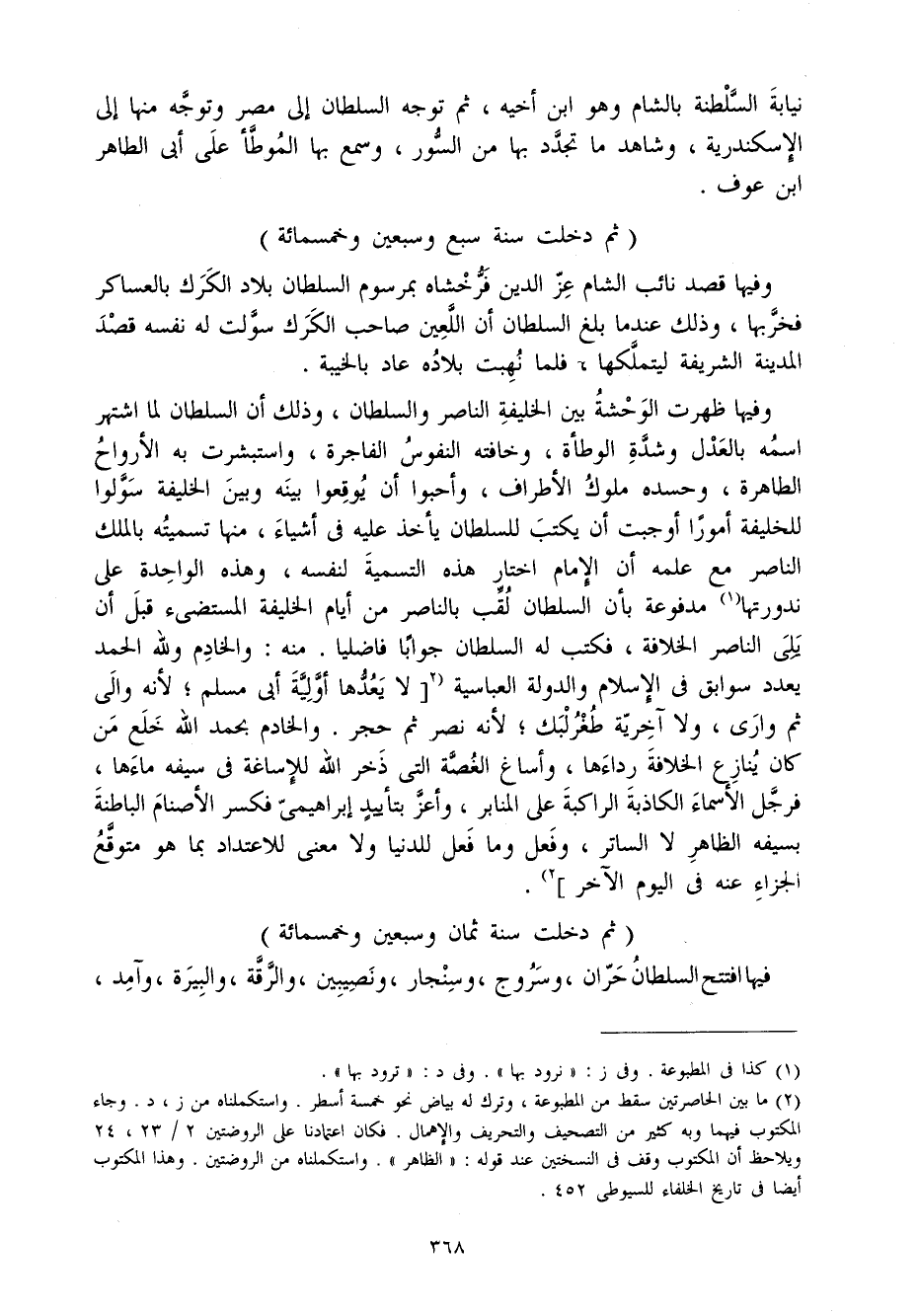 وفيهَا ظَهرت الوحشة بَين الْخَلِيفَة النَّاصِر وَالسُّلْطَان وَذَلِكَ أَن السُّلْطَان لما اشْتهر اسْمه بِالْعَدْلِ وَشدَّة الْوَطْأَة وخافته النُّفُوس الْفَاجِرَة واستبشرت بِهِ الْأَرْوَاح الطاهرة وحسده مُلُوك الْأَطْرَاف وأحبوا أَن يوقعوا بَينه وَبَين الْخَلِيفَة سولوا للخليفة أمورا أوجبت أَن يكْتب للسُّلْطَان يَأْخُذ عَلَيْهِ فِي أَشْيَاء مِنْهَا تَسْمِيَته بِالْملكِ النَّاصِر مَعَ علمه أَن الإِمَام اخْتَار هَذِه التَّسْمِيَة لنَفسِهِ وَهَذِه الْوَاحِدَة على ندورتها مدفوعة بِأَن السُّلْطَان لقب بالناصر من أَيَّام الْخَلِيفَة المستضيء قبل أَن يَلِي النَّاصِر الْخلَافَة فَكتب لَهُ السُّلْطَان جَوَابا فاضليا مِنْهُ وَالْخَادِم وَللَّه الْحَمد يعدد سوابق فِي الْإِسْلَام والدولة العباسية لَا يعدها أولية أبي مُسلم لِأَنَّهُ وَالِي ثمَّ وارى وَلَا آخرية طغرلبك لِأَنَّهُ نصر ثمَّ حجر