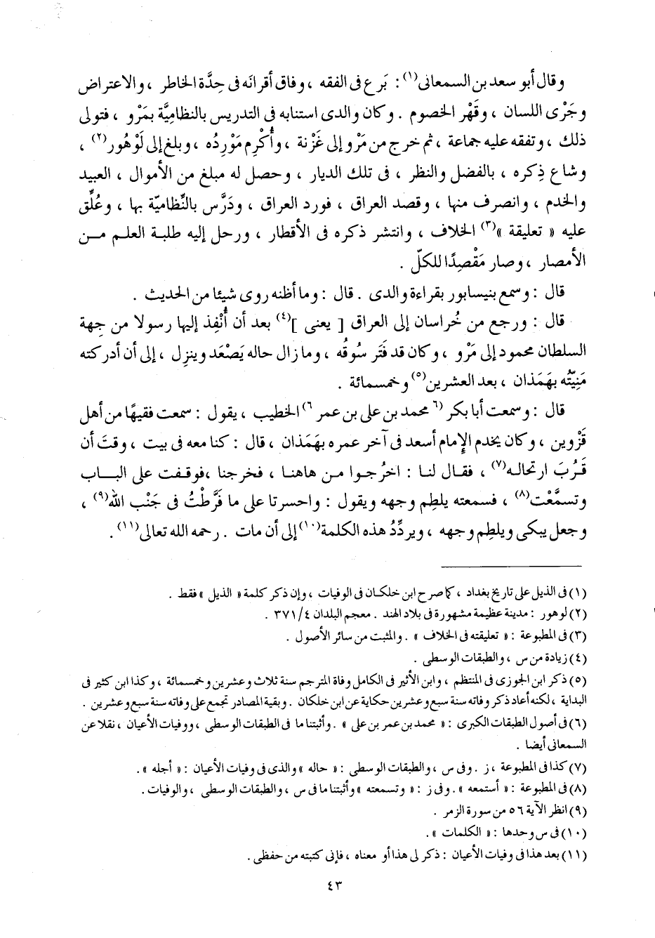 قَالَ وَرجع من خُرَاسَان إِلَى الْعرَاق يَعْنِي بعد أَن أنفذ إِلَيْهَا رَسُولا من جِهَة السُّلْطَان مَحْمُود إِلَى مرو وَكَانَ قد فتر سوقه وَمَا زَالَ حَاله يصعد وَينزل إِلَى أَن أَدْرَكته منيته بهمذان بعد الْعشْرين وَخَمْسمِائة