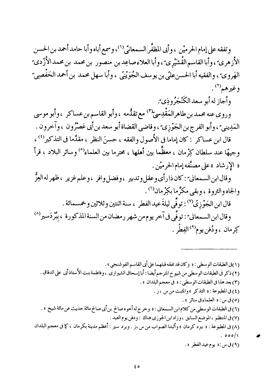 قَالَ ابْن عَسَاكِر كَانَ إِمَامًا فِي الْأُصُول وَالْفِقْه حسن النّظر مقدما فِي التَّذْكِير وجيها عِنْد سُلْطَان كرمان مُعظما بَين أَهلهَا مُحْتَرما بَين الْعلمَاء وَسَائِر الْبِلَاد قَرَأَ الْإِرْشَاد على مُصَنفه إِمَام الْحَرَمَيْنِ