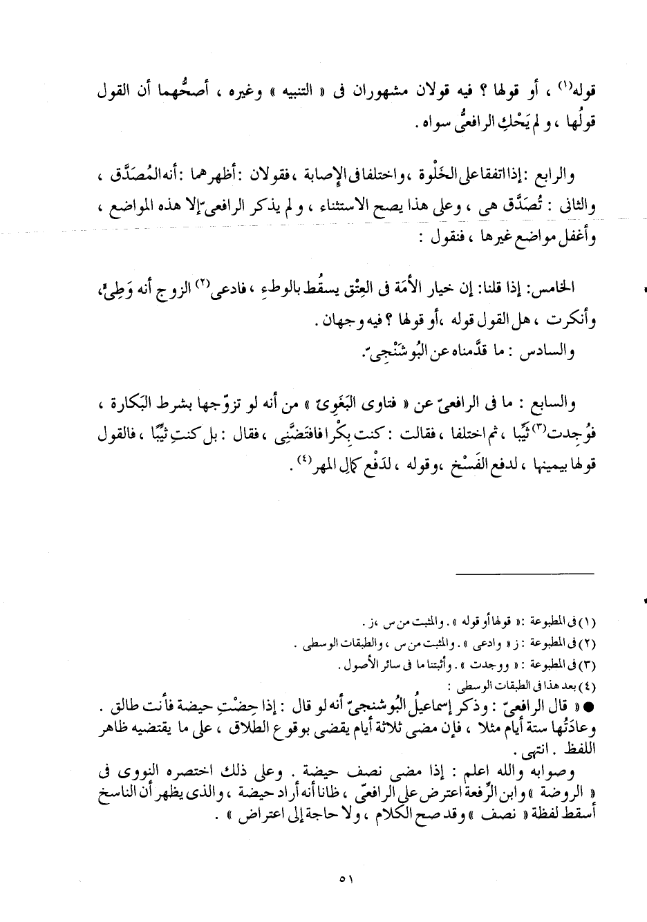 وَالرَّابِع إِذا اتفقَا على الْخلْوَة وَاخْتلفَا فِي الْإِصَابَة فَقَوْلَانِ أظهرهمَا أَنه الْمُصدق وَالثَّانِي تصدق هِيَ وعَلى هَذَا يَصح الِاسْتِثْنَاء وَلم يذكر الرَّافِعِيّ إِلَّا هَذِه الْمَوَاضِع وأغفل مَوَاضِع غَيرهَا فَنَقُول