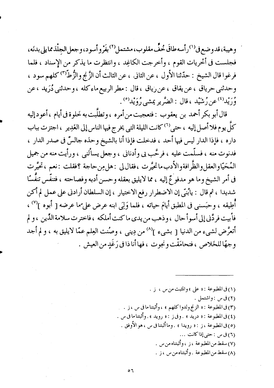 قَالَ أَبُو بكر أَحْمد بن يَعْقُوب فتعجبت من أمره وتطلبت بِهِ خلْوَة فِي أَيَّام أَعُود إِلَيْهِ كل يَوْم فَلَا أصل إِلَيْهِ حَتَّى كَانَت اللَّيْلَة الَّتِي يخرج فِيهَا النَّاس إِلَى الغدير اجتزت بِبَاب دَاره فَإِذا الدَّار لَيْسَ فِيهَا أحد فَدخلت فَإِذا أَنا بالشيخ وَحده جَالس فِي صدر الدَّار فدنوت مِنْهُ فَسلمت عَلَيْهِ فَرَحَّبَ بِي وأدناني وَجعل يسألني وَرَأَيْت مِنْهُ من جميل المحيار وَالْعقل والظرافة وَالْأَدب مَا تحيرت فَقَالَ لي هَل من حَاجَة فَقلت نعم تحيرت فِي أَمر الشَّيْخ وَمَا هُوَ مَدْفُوع إِلَيْهِ مِمَّا لَا يَلِيق بعقله وَحسن أدبه وفصاحته فتنفس تنفسا شَدِيدا ثمَّ قَالَ يَا بني إِن الِاضْطِرَار رفع الِاخْتِيَار إِن السُّلْطَان أرادني على عمل لم أكن أُطِيقهُ وحبسني فِي المطبق أَيَّام حَيَاته فَلَمَّا ولى ابْنه عرض عَليّ مَا عرضه أَبوهُ فأبيت فردني إِلَى أَسْوَأ حَال وَذهب من يَدي مَا كنت أملكهُ فاخترت سَلامَة الدّين وَلم أتعرض لشَيْء من الدُّنْيَا بِشَيْء من ديني وصنت الْعلم عَمَّا لَا يَلِيق بِهِ وَلم أجد وَجها للخلاص فتحامقت ونجوت فها أَنا ذَا فِي رغد من الْعَيْش