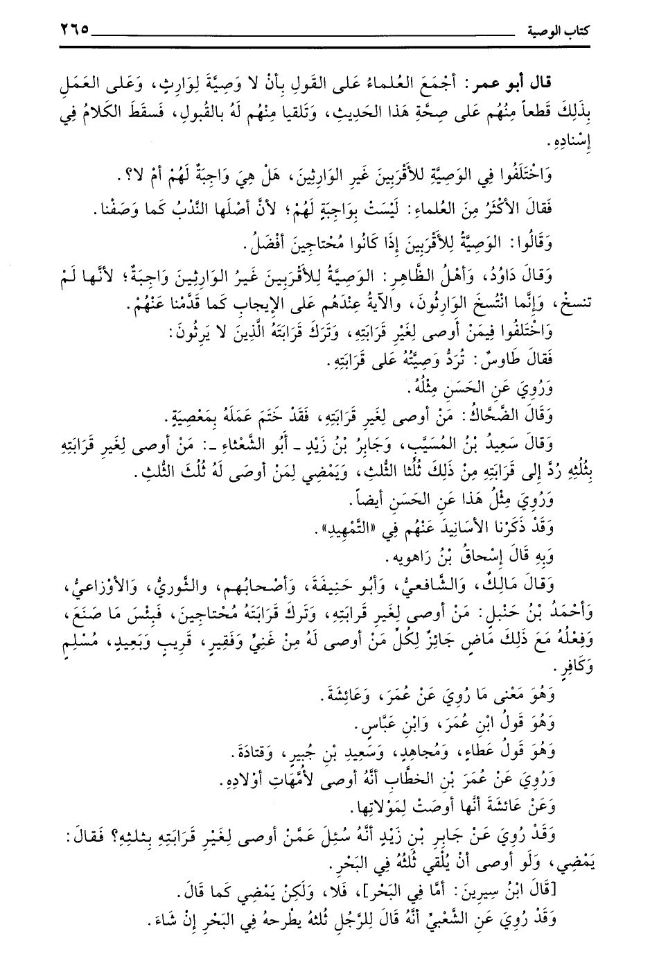 وَقَالَ مَالِكٌ وَالشَّافِعِيُّ وَأَبُو حَنِيفَةَ وَأَصْحَابِهِمْ وَالثَّوْرِيِّ وَالْأَوْزَاعِيِّ وَأَحْمَدَ بْنِ حَنْبَلٍ مَنْ أَوْصَى لِغَيْرِ قَرَابَتِهِ وَتَرَكَ قَرَابَتَهُ مُحْتَاجِينَ فَبِئْسَ مَا صَنَعَ وَفِعْلُهُ مَعَ ذَلِكَ مَاضٍ جَائِزٌ لِكُلِّ مَنْ أَوْصَى لَهُ مِنْ غَنِيٍّ وَفَقِيرٍ قَرِيبٍ وَبَعِيدٍ مُسْلِمٍ وَكَافِرٍ