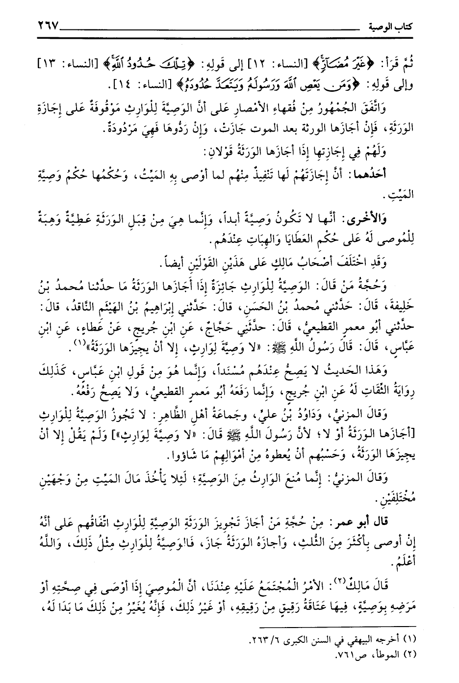 ثُمَّ قَرَأَ (غَيْرَ مُضَارٍّ) النِّسَاءِ 12 إِلَى قَوْلِهِ (تِلْكَ حُدُودُ اللَّهِ) النِّسَاءِ 13 وَإِلَى قَوْلِهِ (وَمَنْ يعص الله ورسوله ويتعد حدوده) النِّسَاءِ 14