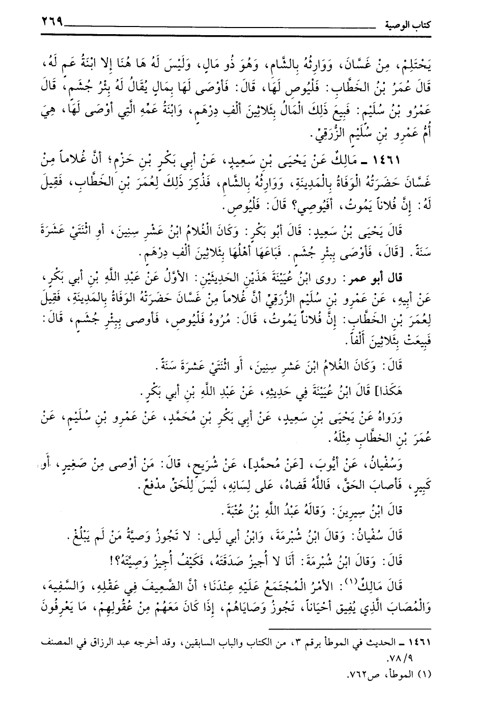 1461 - مَالِكٌ عَنْ يَحْيَى بْنِ سَعِيدٍ عَنْ أَبِي بَكْرٍ بْنِ حَزْمٍ أَنَّ غُلَامًا مِنْ غَسَّانَ حَضَرَتْهُ الْوَفَاةُ بِالْمَدِينَةِ وَوَارِثُهُ بِالشَّامِ فَذُكِرَ ذَلِكَ لِعُمَرَ بْنِ الْخَطَّابِ فَقِيلَ لَهُ إِنَّ فُلَانًا يَمُوتُ أَفَيُوصِي قَالَ فَلْيُوصِ