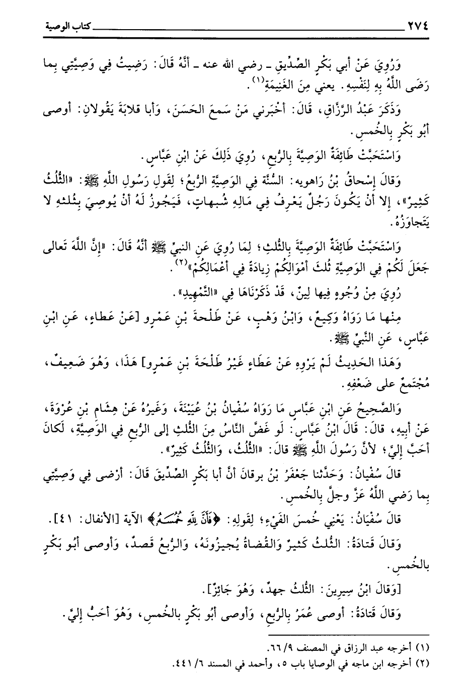 والصحيح عن بن عَبَّاسٍ مَا رَوَاهُ سُفْيَانُ بْنُ عُيَيْنَةَ وَغَيْرُهُ عَنْ هِشَامِ بْنِ عُرْوَةَ عَنْ أَبِيهِ قَالَ قال بن عَبَّاسٍ لَوْ غَضَّ النَّاسُ مِنَ الثُّلُثِ إِلَى الرُّبُعِ فِي الْوَصِيَّةِ لَكَانَ أَحَبَّ إِلَيَّ لِأَنَّ رَسُولَ اللَّهِ صَلَّى اللَّهُ عَلَيْهِ وَسَلَّمَ قال (الثُّلُثُ وَالثُّلُثُ كَثِيرٌ)