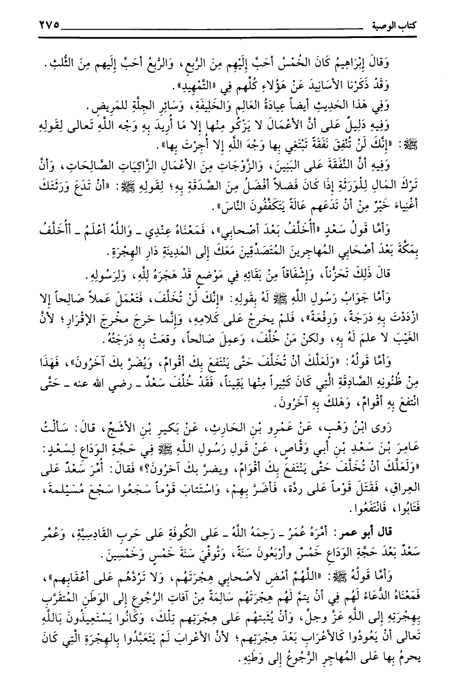 وَفِيهِ أَنَّ النَّفَقَةَ عَلَى الْبَنِينِ وَالزَّوْجَاتِ مِنَ الْأَعْمَالِ الزَّاكِيَاتِ الصَّالِحَاتِ وَأَنَّ تَرْكَ الْمَالِ لِلْوَرَثَةِ إِذَا كَانَ فَضْلًا أَفْضَلُ مِنَ الصَّدَقَةِ بِهِ لِقَوْلِهِ صَلَّى اللَّهُ عَلَيْهِ وَسَلَّمَ (أَنْ تَدَعَ وَرَثَتَكَ أَغْنِيَاءَ خَيْرٌ مِنْ أَنْ تَدَعَهُمْ عَالَةً يَتَكَفَّفُونَ النَّاسَ)