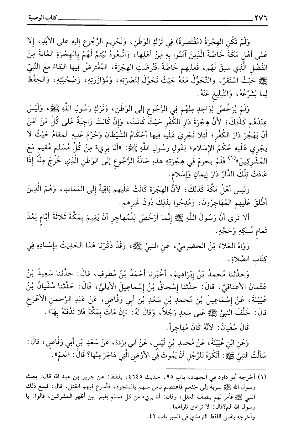 وعن بن عُيَيْنَةَ عَنْ مُحَمَّدِ بْنِ قَيْسٍ عَنْ أَبِي بُرْدَةَ عَنْ سَعْدِ بْنِ أَبِي وَقَّاصٍ قَالَ سَأَلْتُ النَّبِيَّ صَلَّى اللَّهُ عَلَيْهِ وَسَلَّمَ أَتَكْرَهُ لِلرَّجُلِ أَنْ يَمُوتَ فِي الْأَرْضِ الَّتِي هَاجَرَ مِنْهَا قَالَ (نَعَمْ