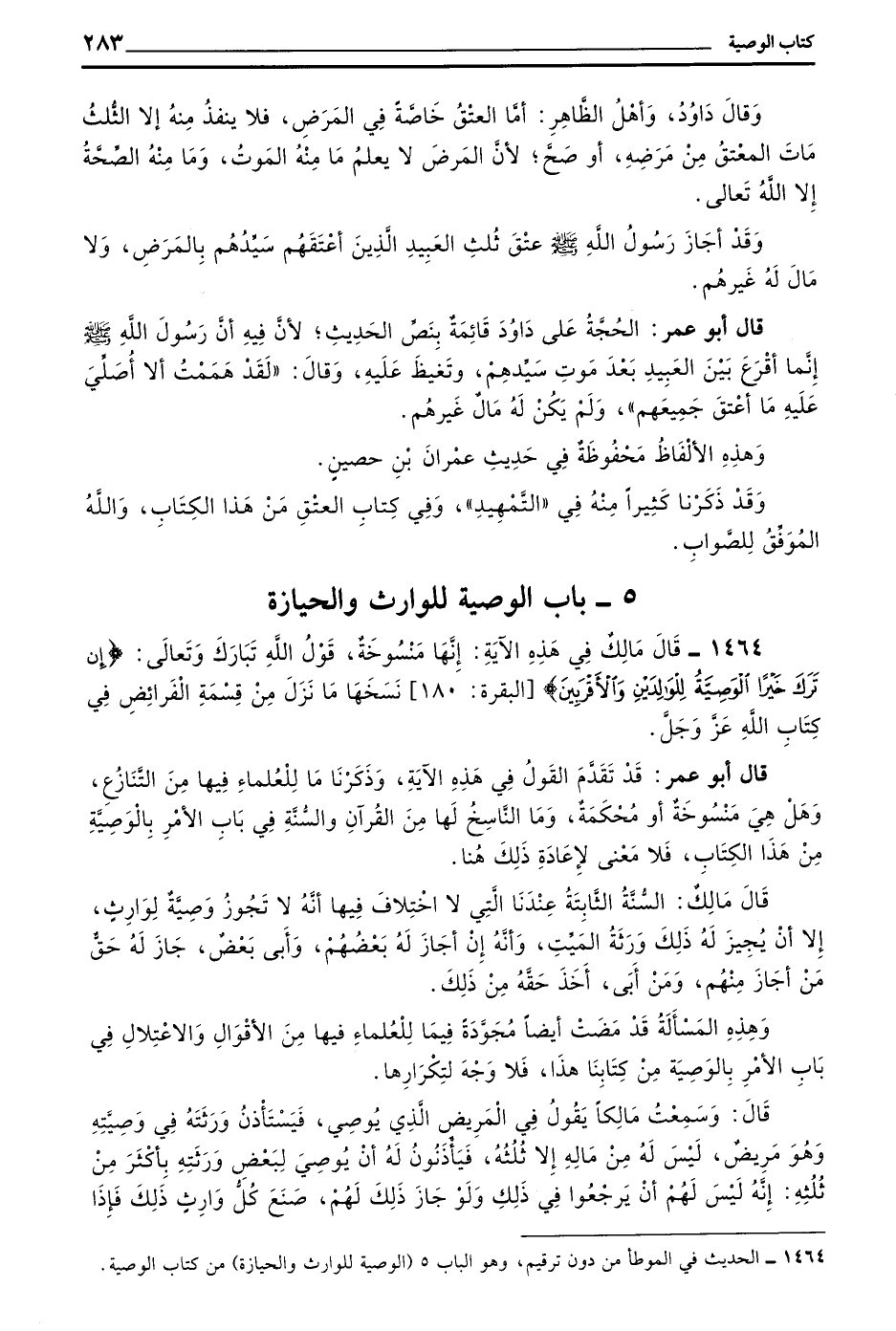 1464 - قَالَ مَالِكٌ فِي هَذِهِ الْآيَةِ إِنَّهَا مَنْسُوخَةٌ قَوْلُ اللَّهِ تَبَارَكَ وَتَعَالَى (إِنْ تَرَكَ خَيْرًا الْوَصِيَّةُ لِلْوَالِدَيْنِ وَالْأَقْرَبِينَ) الْبَقَرَةِ 180 نَسَخَهَا مَا نَزَلَ مِنْ قِسْمَةِ الْفَرَائِضِ فِي كِتَابِ اللَّهِ عَزَّ وَجَلَّ