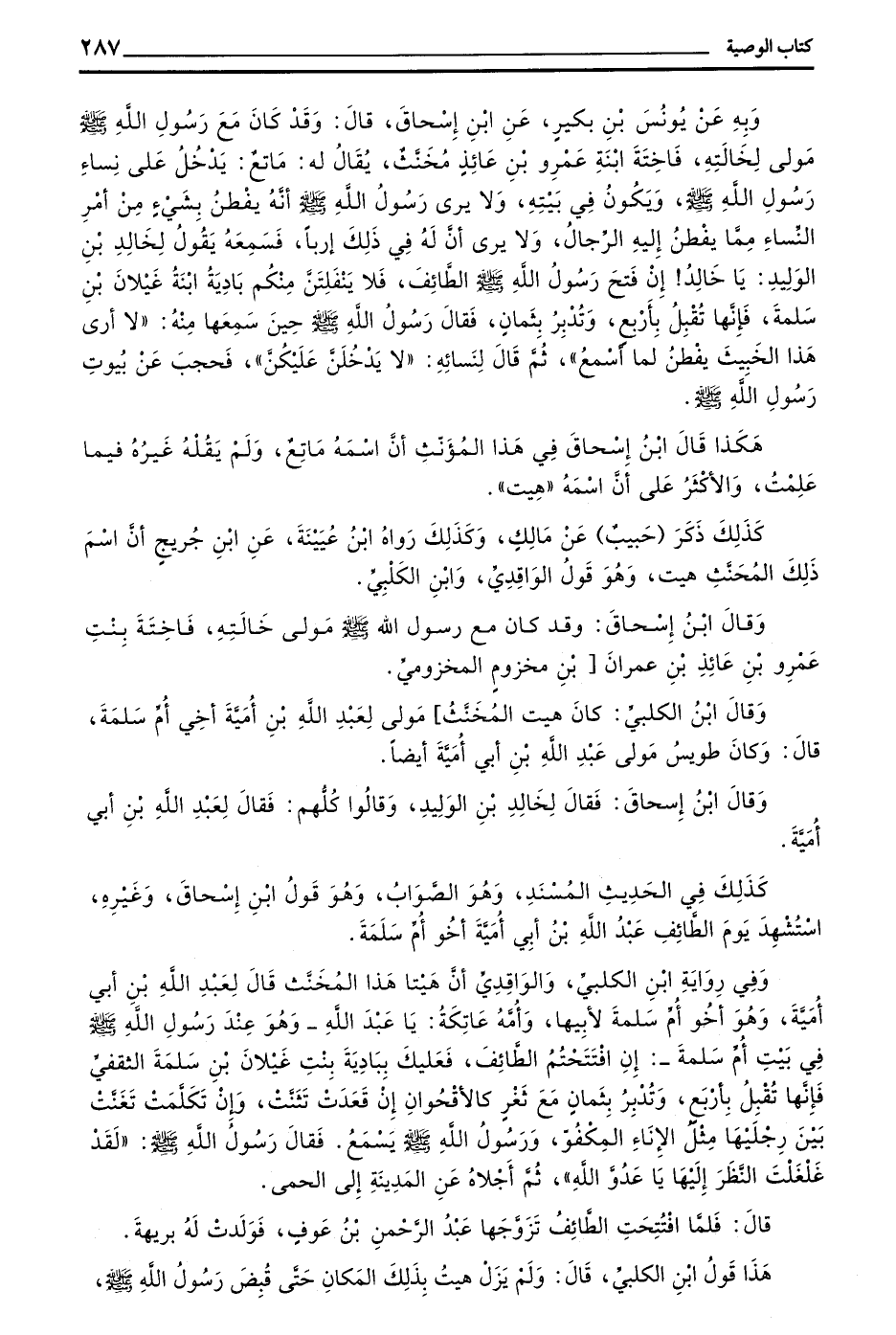 وبه عن يونس بن بكير عن بن إِسْحَاقَ قَالَ وَقَدْ كَانَ مَعَ رَسُولِ اللَّهِ صَلَّى اللَّهُ عَلَيْهِ وَسَلَّمَ مَوْلًى لِخَالَتِهِ فَاخِتَةَ ابْنَةِ عَمْرِو بْنِ عَائِذٍ مُخَنَّثٌ يُقَالُ لَهُ مَاتِعٌ يَدْخُلُ عَلَى نِسَاءِ رَسُولِ اللَّهِ صَلَّى اللَّهُ عَلَيْهِ وَسَلَّمَ وَيَكُونُ فِي بَيْتِهِ وَلَا يَرَى رَسُولِ اللَّهِ صَلَّى اللَّهُ عَلَيْهِ وَسَلَّمَ أَنَّهُ يَفْطِنُ بِشَيْءٍ مِنْ أَمْرِ النِّسَاءِ مِمَّا يَفْطِنُ إِلَيْهِ الرِّجَالُ وَلَا يَرَى أَنَّ لَهُ فِي ذَلِكَ إِرْبًا فَسَمِعَهُ يَقُولُ لِخَالِدِ بْنِ الْوَلِيدِ يَا خَالِدُ! إِنْ فَتَحَ رَسُولُ اللَّهِ صَلَّى اللَّهُ عَلَيْهِ وَسَلَّمَ الطَّائِفَ فَلَا يَنْفَلِتَنَّ مِنْكُمْ بَادِيَةُ ابْنَةُ غَيْلَانَ بْنِ سَلَمَةَ فَإِنَّهَا تُقْبِلُ بِأَرْبَعٍ وَتُدْبِرُ بِثَمَانٍ فَقَالَ رَسُولُ اللَّهِ صَلَّى اللَّهُ عَلَيْهِ وَسَلَّمَ حِينَ سَمِعَهَا مِنْهُ (لَا أَرَى هَذَا الْخَبِيثَ يَفْطِنُ لِمَا أَسْمَعُ) ثُمَّ قَالَ لِنِسَائِهِ (لَا يَدْخُلَنَّ عَلَيْكُنَّ) فَحُجِبَ عَنْ بُيُوتِ رَسُولِ اللَّهِ صَلَّى اللَّهُ عَلَيْهِ وسلم