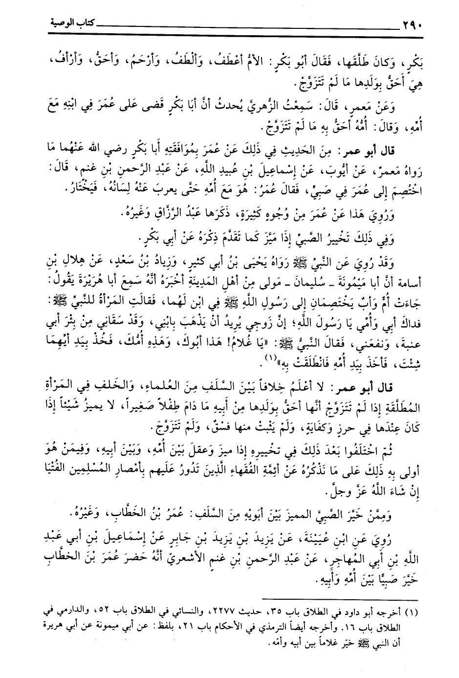 ثُمَّ اخْتَلَفُوا بَعْدَ ذَلِكَ فِي تَخْيِيرِهِ إِذَا مَيَّزَ وَعَقِلَ بَيْنَ أُمِّهِ وَبَيْنَ أَبِيهِ وَفِيمَنْ هو اولى به ذَلِكَ عَلَى مَا نَذْكُرُهُ عَنْ أَئِمَّةِ الْفُقَهَاءِ الَّذِينَ تَدُورُ عَلَيْهِمْ بِأَمْصَارِ الْمُسْلِمِينَ الْفُتَيَا إِنْ شَاءَ اللَّهُ عَزَّ وَجَلَّ