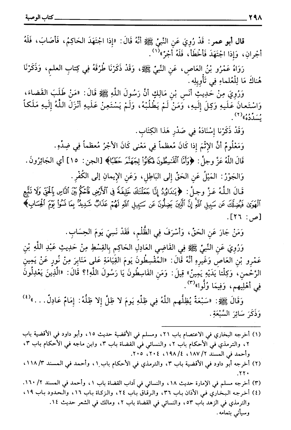 وَرُوِيَ عَنِ النَّبِيِّ صَلَّى اللَّهُ عَلَيْهِ وَسَلَّمَ فِي الْقَاضِي الْعَادِلِ الْحَاكِمِ بِالْقِسْطِ مِنْ حَدِيثِ عَبْدِ اللَّهِ بْنِ عَمْرِو بْنِ الْعَاصِ وَغَيْرِهِ أَنَّهُ قَالَ (الْمُقْسِطُونَ يَوْمَ الْقِيَامَةِ عَلَى مَنَابِرَ مِنْ نُورٍ عَنْ يَمِينِ الرَّحْمَنِ وَكِلْتَا يَدَيْهِ يَمِينٌ) قيل ومن الْقَاسِطُونَ يَا رَسُولَ اللَّهِ! قَالَ (الَّذِينَ يَعْدِلُونَ فِي أَهْلِيهِمْ وَفِيمَا وُلُّوا)