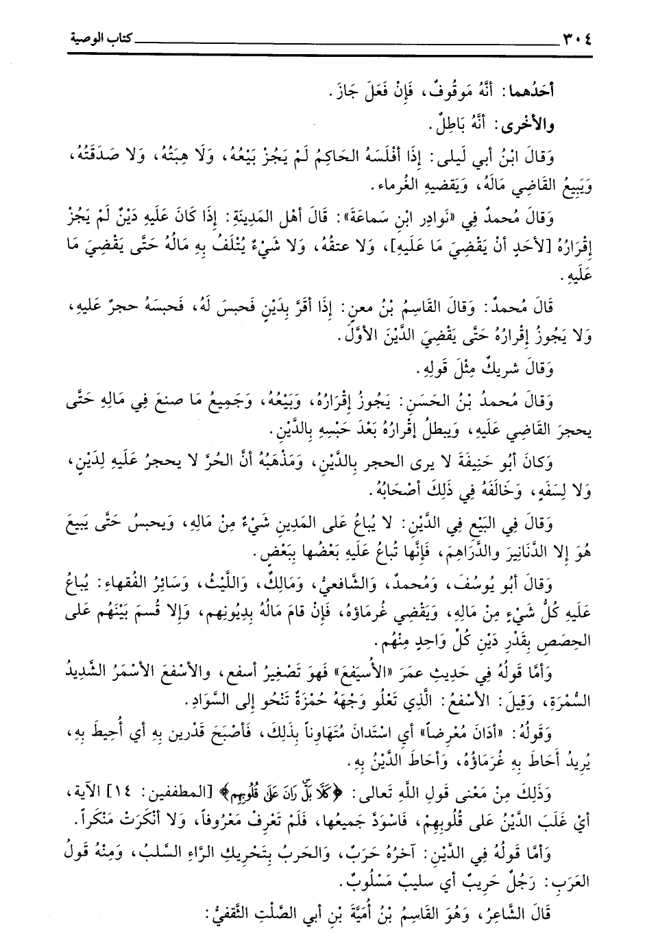 وَقَالَ مُحَمَّدٌ فِي (نَوَادِرِ بن سَمَاعَةَ) قَالَ أَهْلُ الْمَدِينَةِ إِذَا كَانَ عَلَيْهِ دَيْنٌ لَمْ يَجُزْ إِقْرَارُهُ لِأَحَدٍ أَنْ يَقْضِيَ مَا عَلَيْهِ وَلَا عِتْقُهُ وَلَا شَيْءٌ يَتْلَفُ بِهِ مَالُهُ حَتَّى يَقْضِيَ مَا عَلَيْهِ